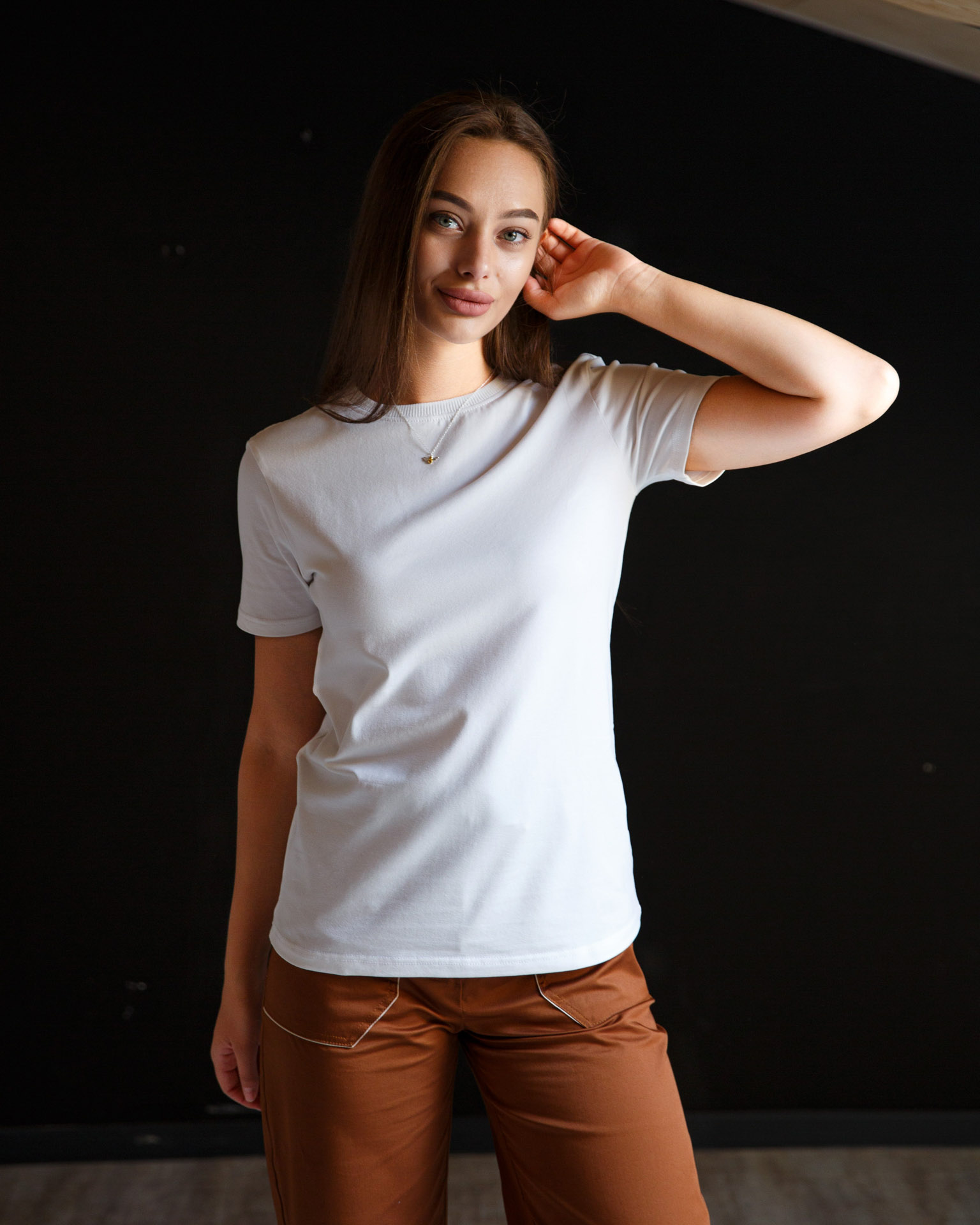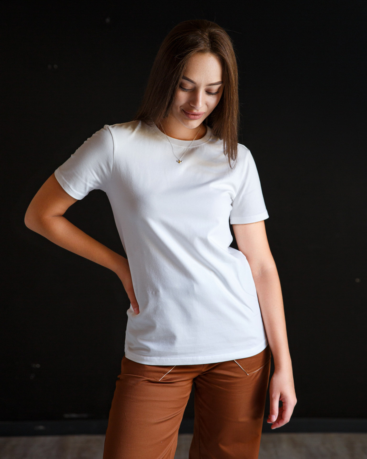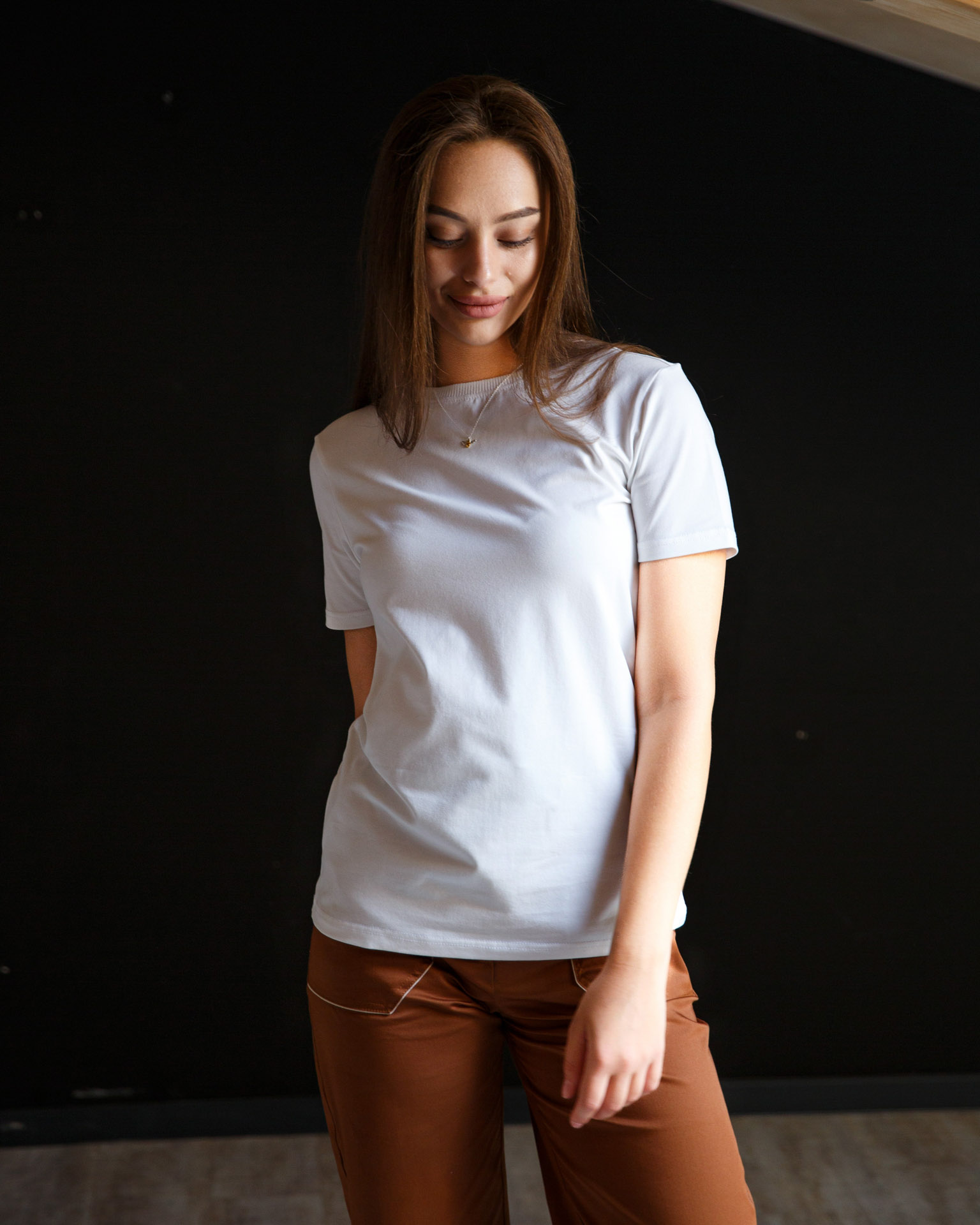 Опис. Молочна жіноча футболка класичного крою. Базова модель прекрасно підійде для поповнення гардеробу не зважаючи на пору року, адже виконана з тканини преміальної якості. Фасон напівприталений. Короткі рукави. Круглий виріз горловини, оброблений трикотажною резинкою рібана в колір. Всі шви відстрочені та укріплені.
