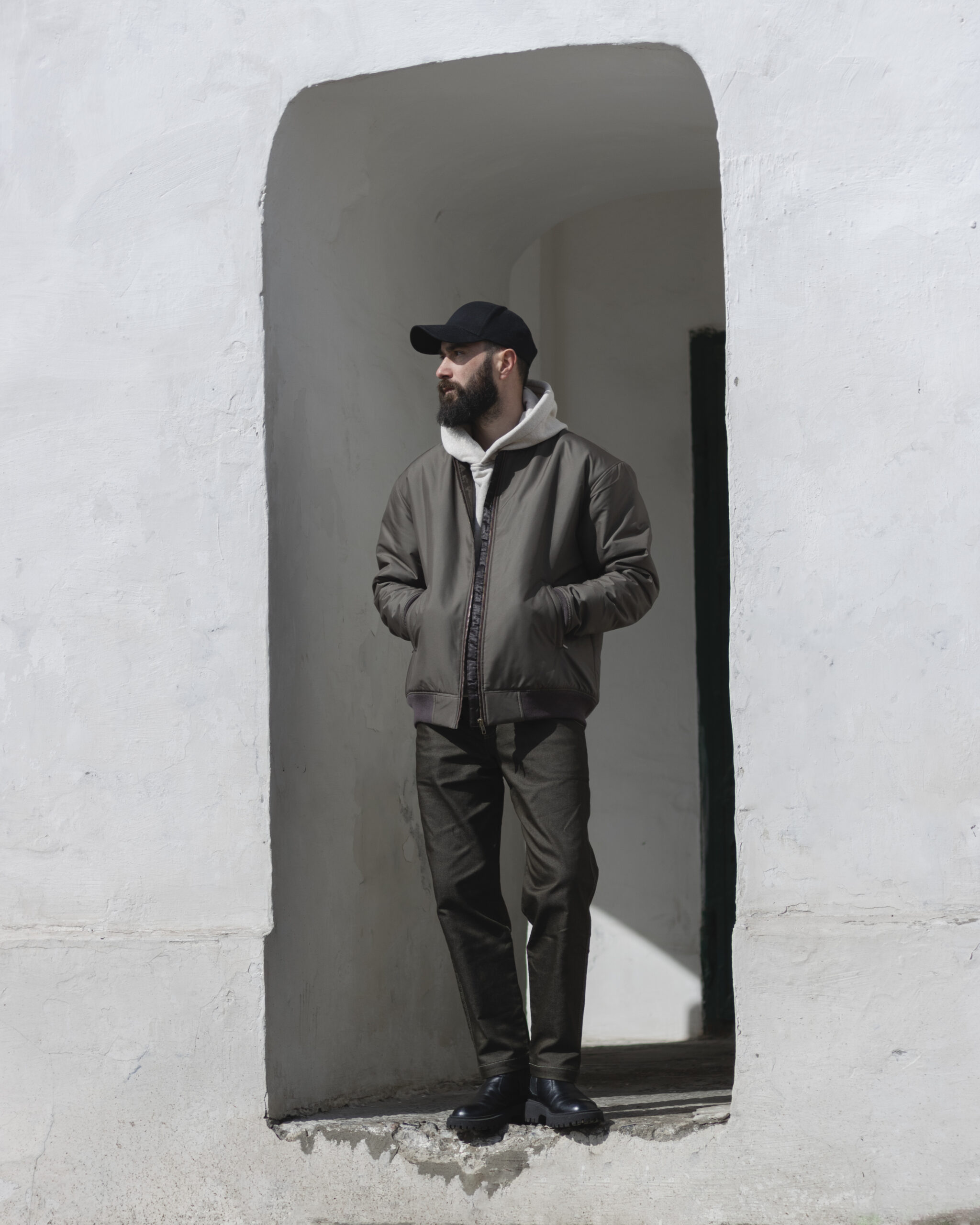 Джинси для щоденного носіння, виконані з еластичного деніму середньої щільності. Дві вмісткі бічні кишені, міні-кишеня для дрібниць, дві накладні кишені ззаду, укріплені металевими хольнітенами. Подвійний пояс зі шльовками. Застібка на блискавку та гудзик.
