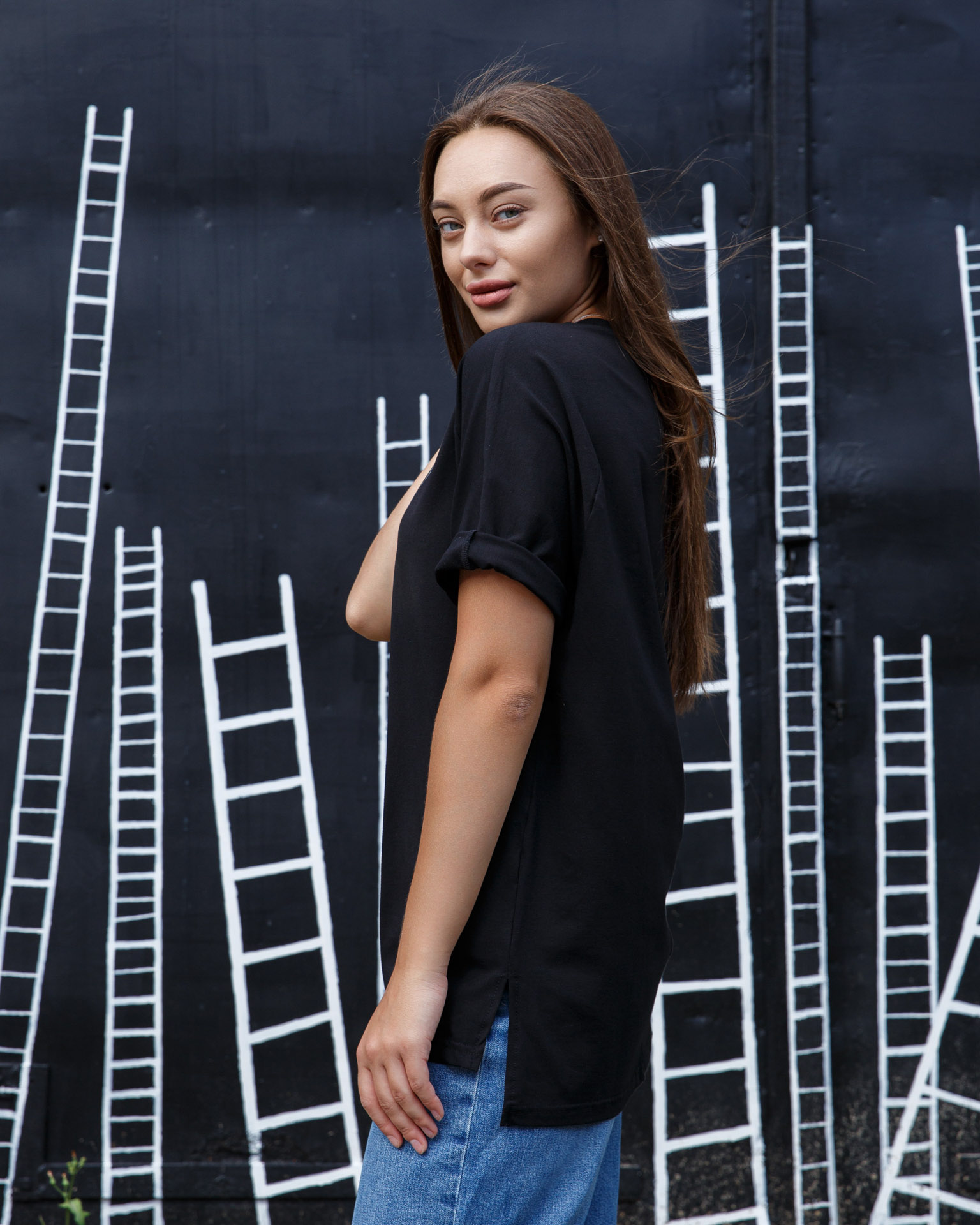 Опис. Футболка унісекс з суцільнокроєним рукавом та рельєфним швом на спинці. Круглий виріз горловини оброблено щільною еластичною резинкою рібана. Фасон вільний, напівприталений.