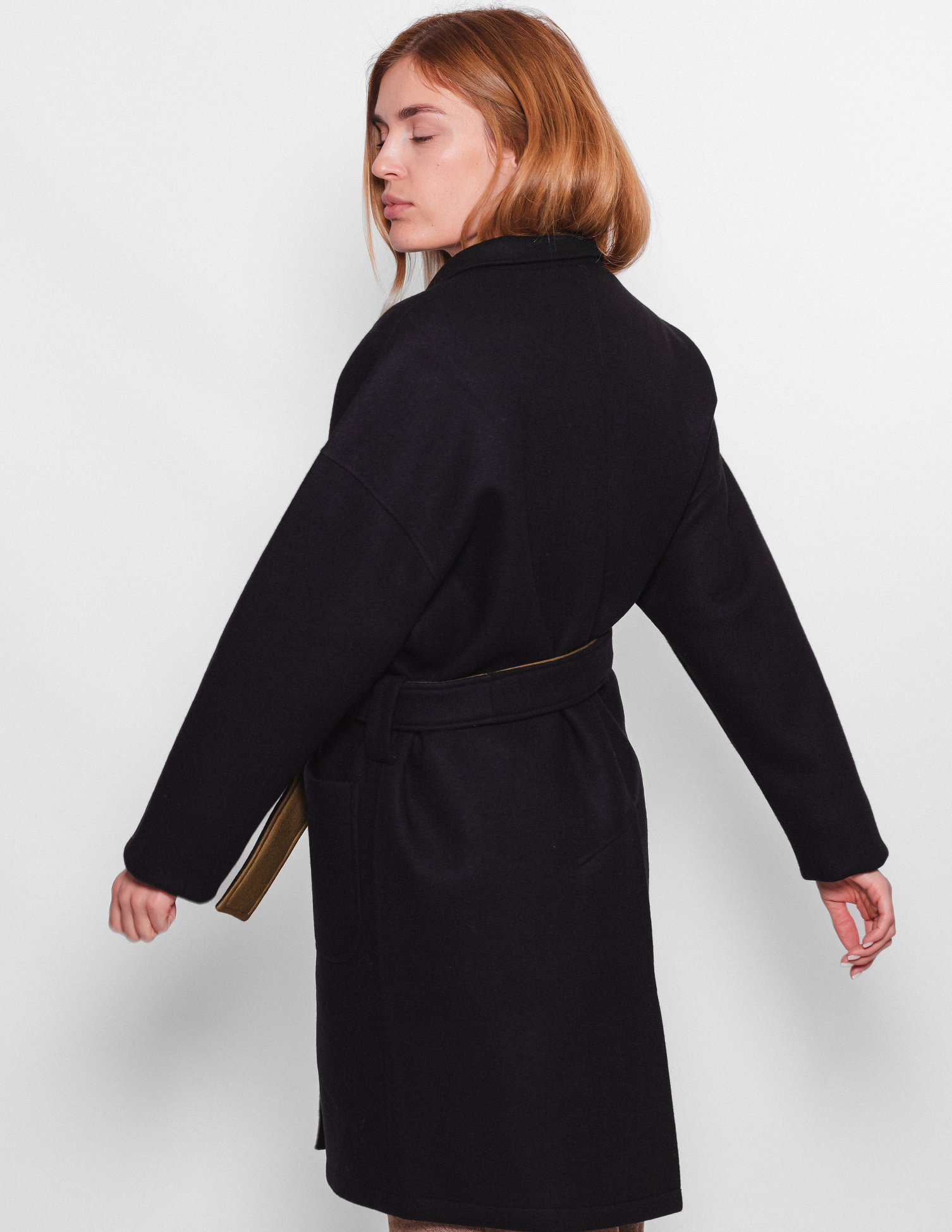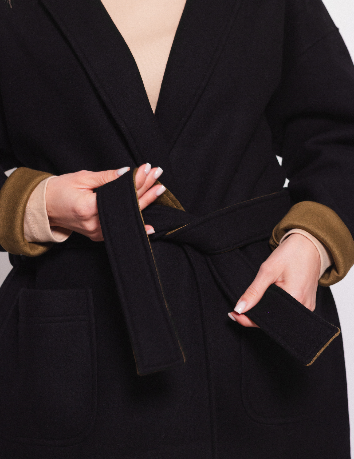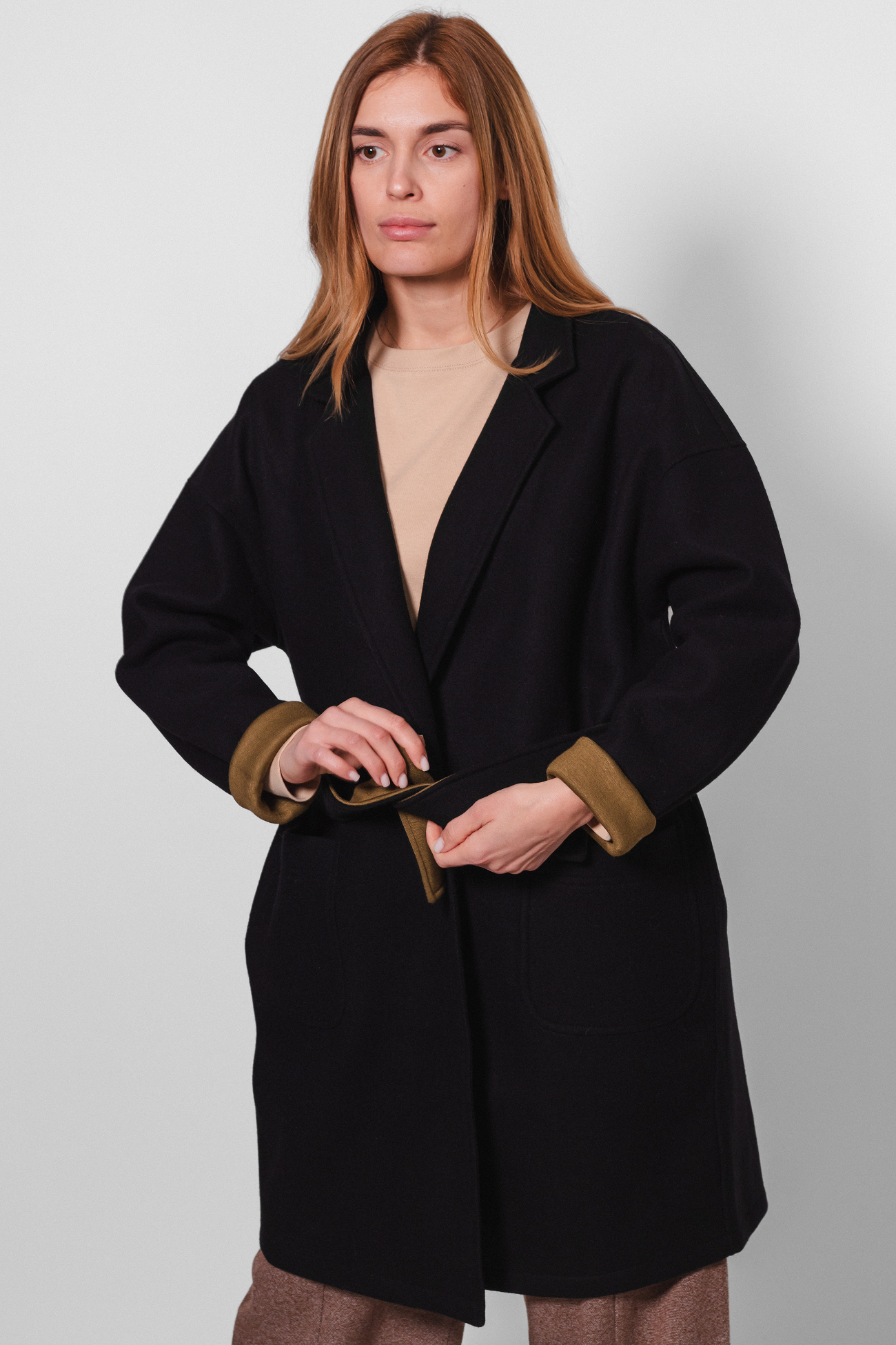 Контрастні кольори та подовжені рукави розширюють варіанти стилізації пальто, коли можна підкотити манжети та вдягти пояс темно-оливковим кольором назовні.