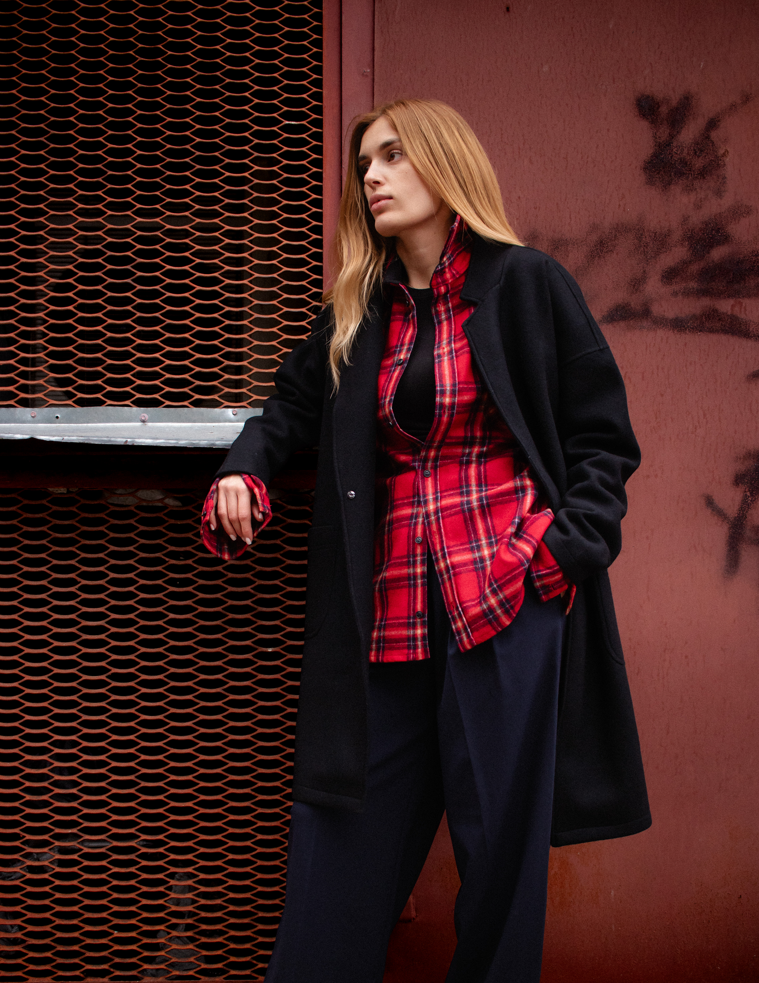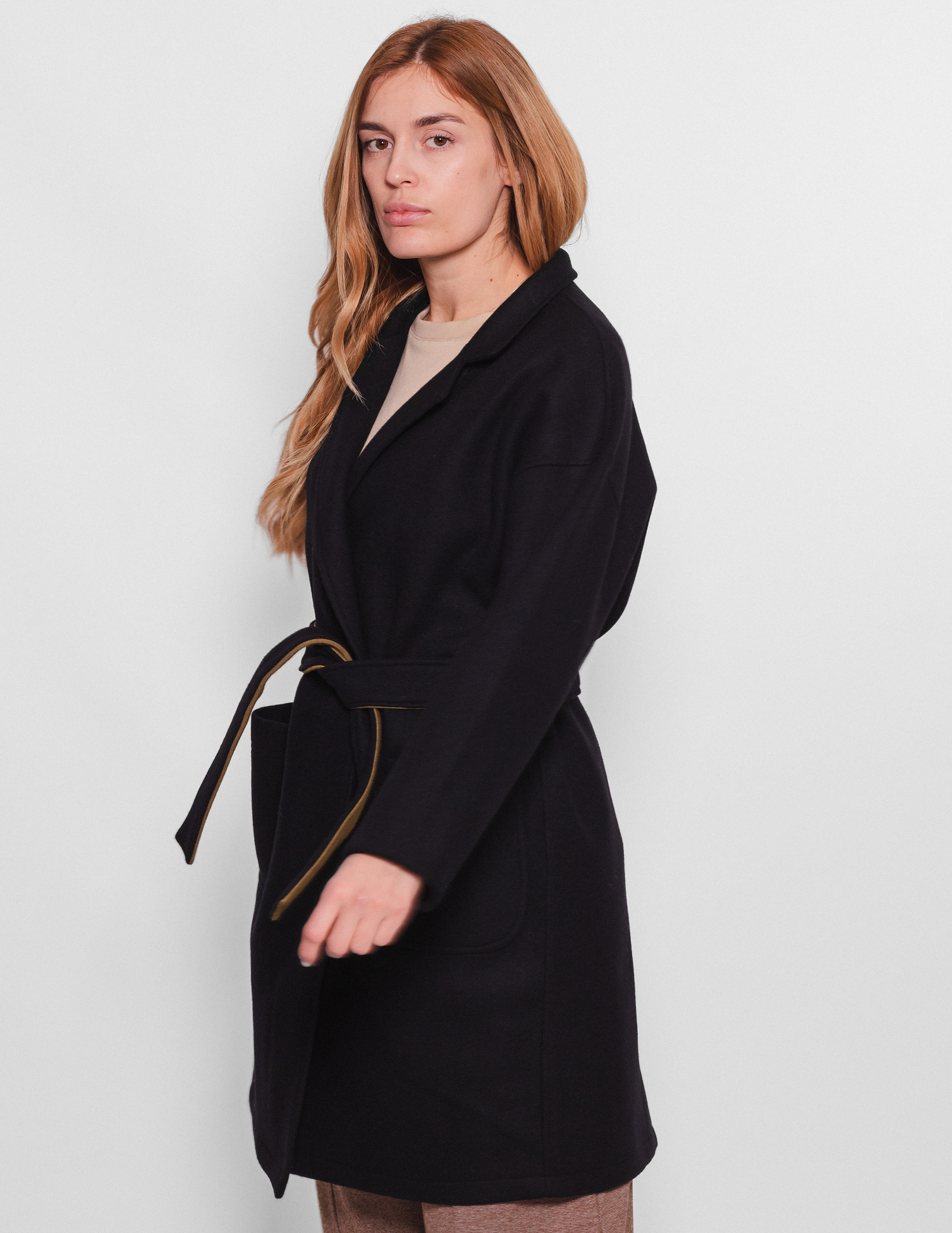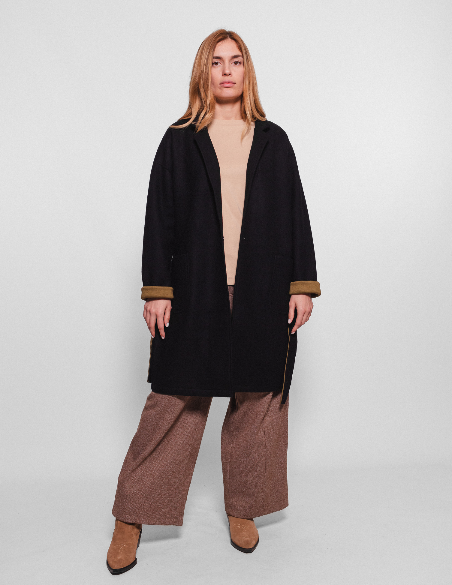 Контрастні кольори та подовжені рукави розширюють варіанти стилізації пальто, коли можна підкотити манжети та вдягти пояс темно-оливковим кольором назовні.