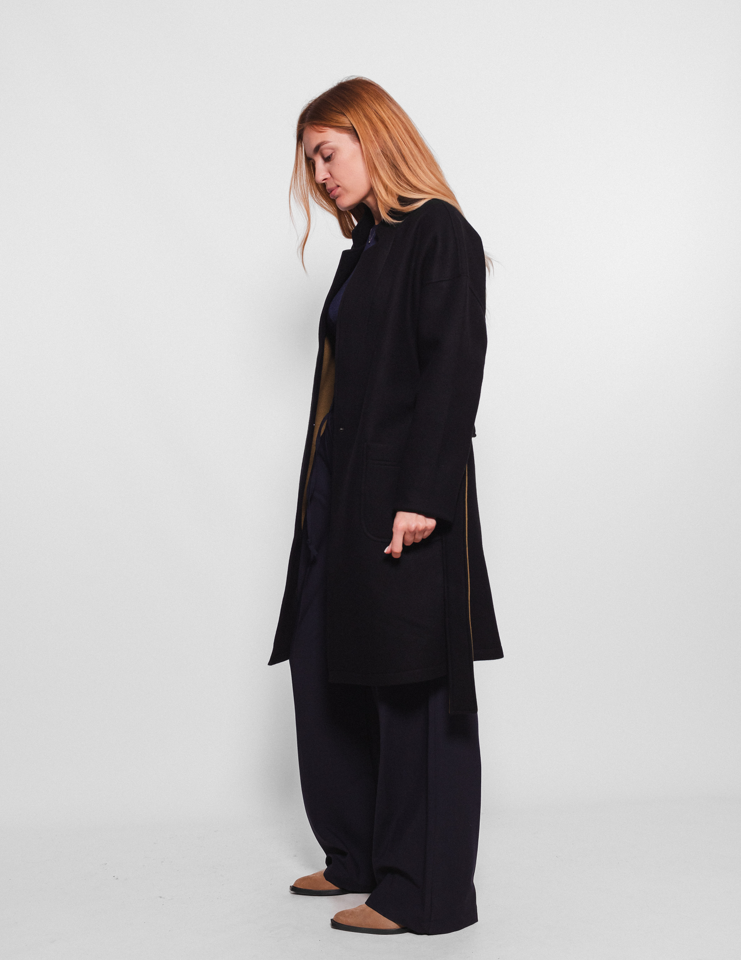 Напівпальто-кардиган з італійської сумішевої вовни вищої якості. Має еластичне двостороннє переплетення: зовні складається з фактурної 100% вовни, а з внутрішньої сторони – м’яка бавовна з тонким утепленням.