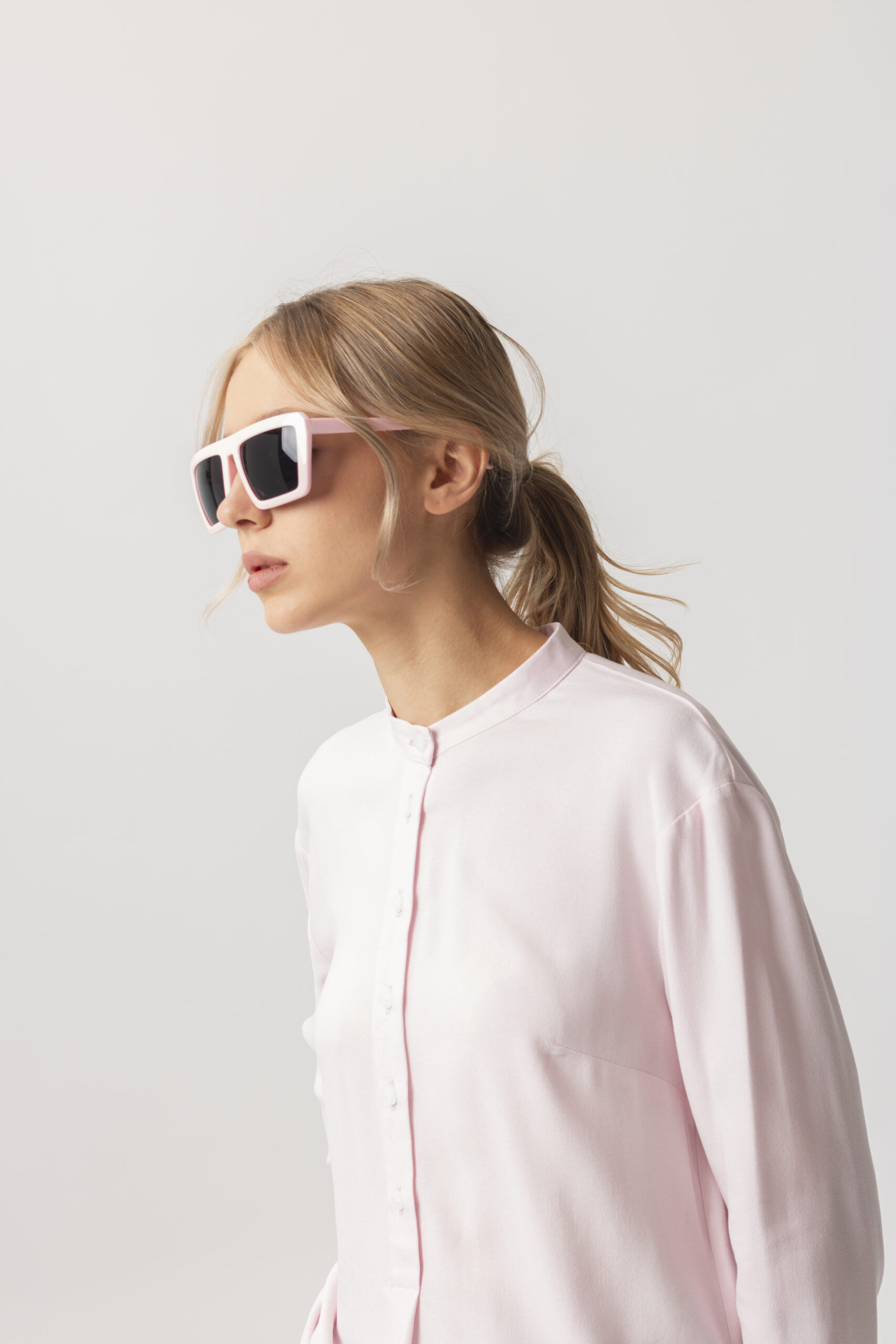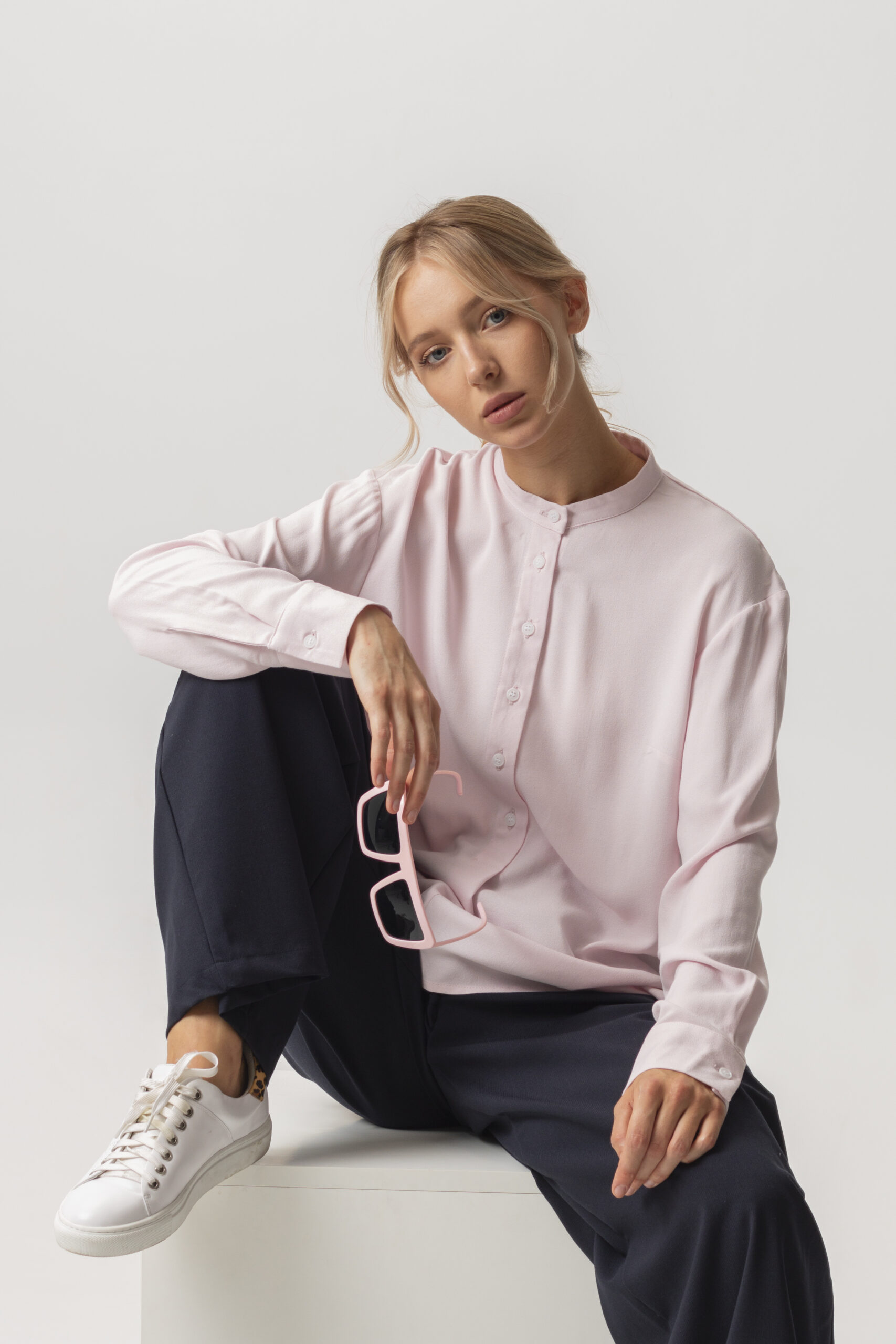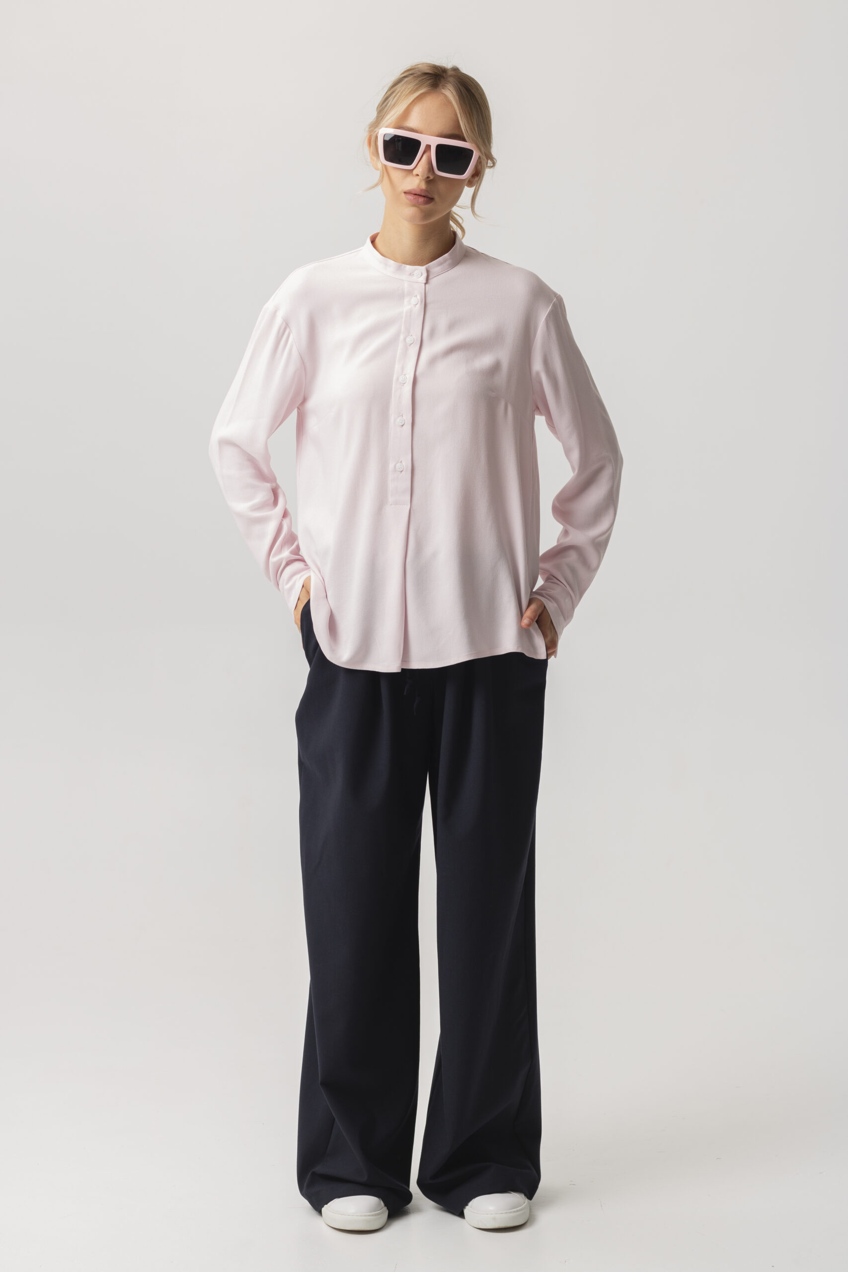 Струмуюча блуза із застібкою поло. Вільний напівприталений силует. Круглий виріз горловини з невеликою стійкою. Довгі рукави, класичний манжет на гудзику. Складка на спинці. Створює ніжний спадаючий силует, підкреслюючи жіночність форм.