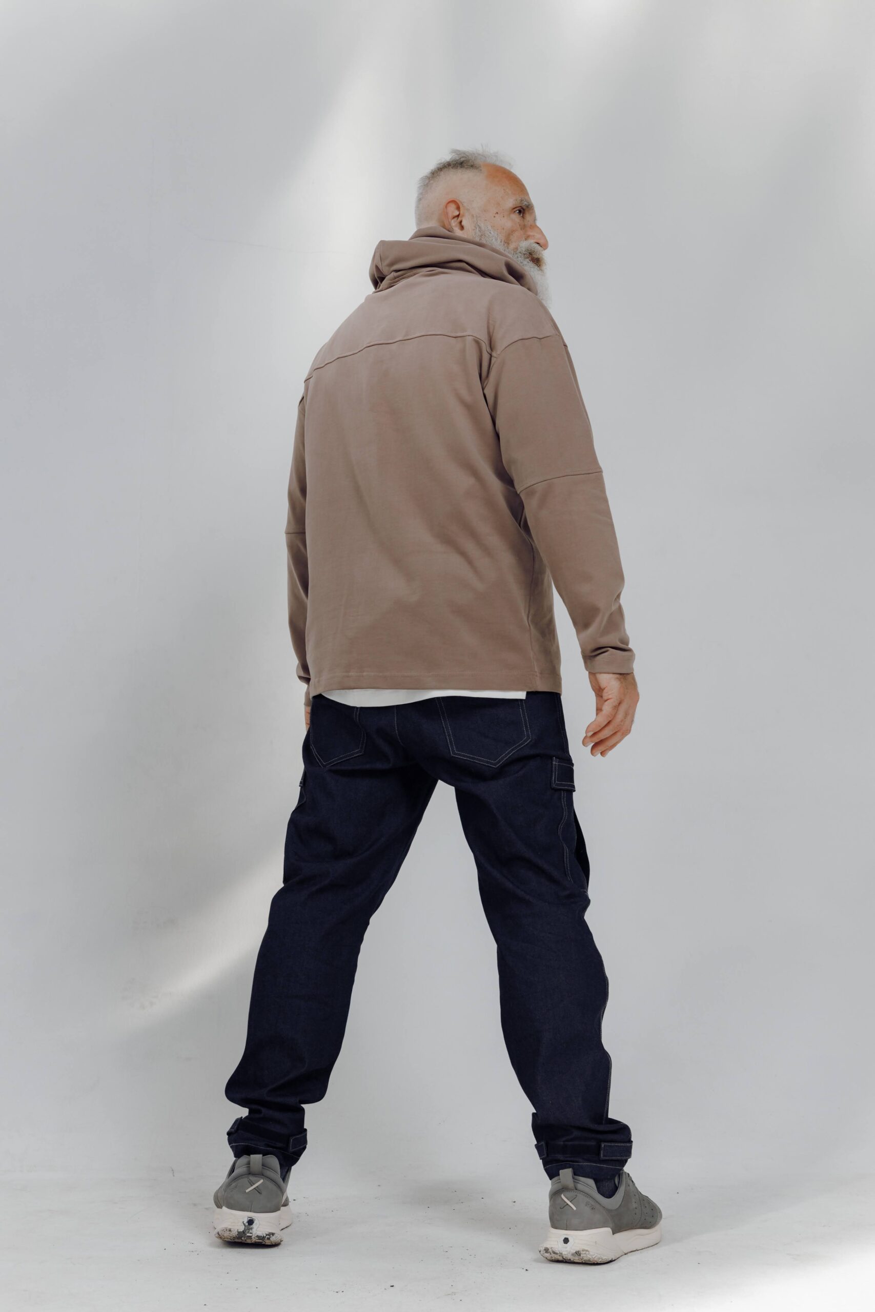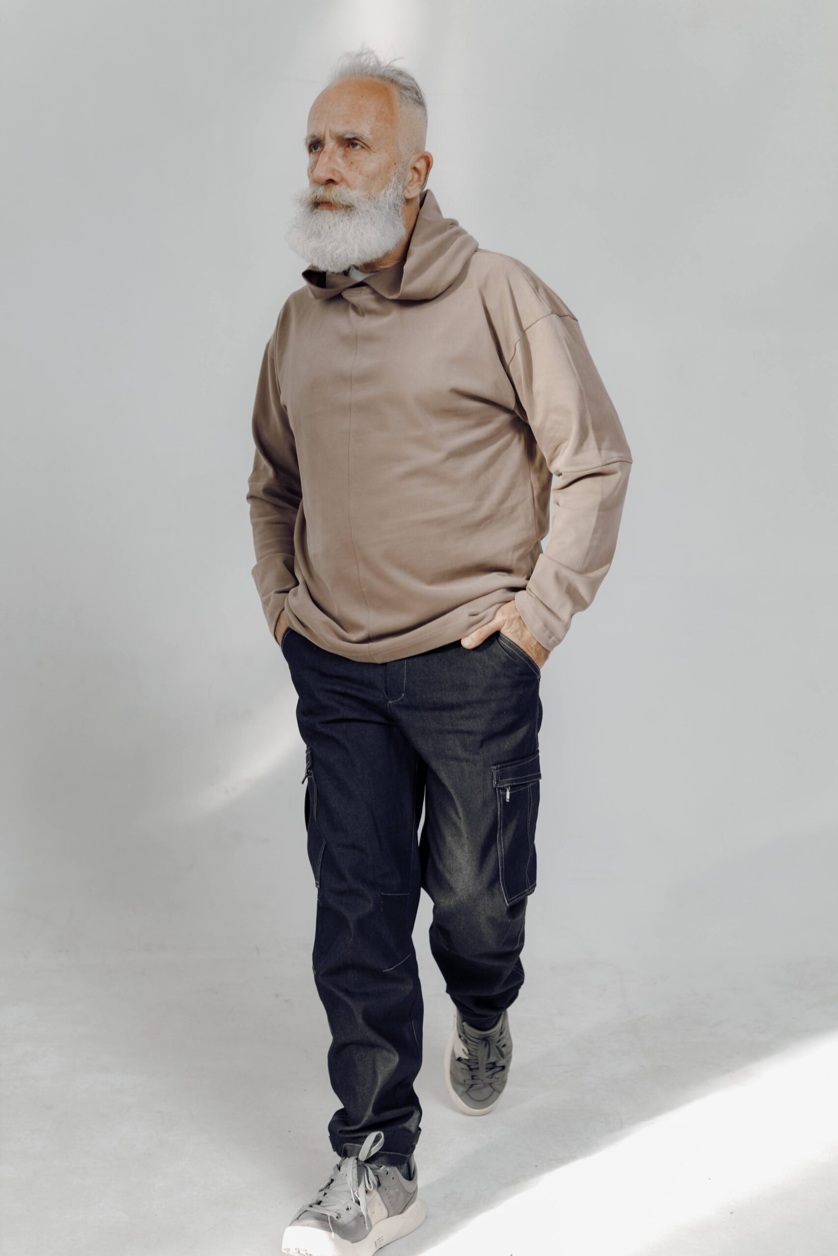 Чоловіче бавовняне худі. Спущене плече, крій вільний, напівприталений. Рельєфні шви на спинці на спереду. Подовжений рукав. Капюшон подвійний суцільний з функціональними елементами.