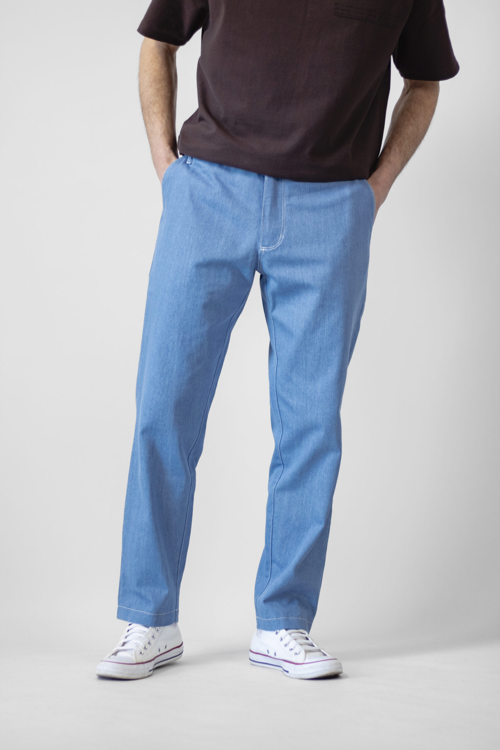 Опис. Чоловічі штани-чіно з джинсу діагонального плетіння. Крій завужений. Середня довжина (зріст моделі 176 см). Застібка на блискавку та гудзик (металева фурнітура УКК). Дві бічні кишені, дві задні кишені-обманки. Посадка на талії, шльовки під пояс/ремінь.