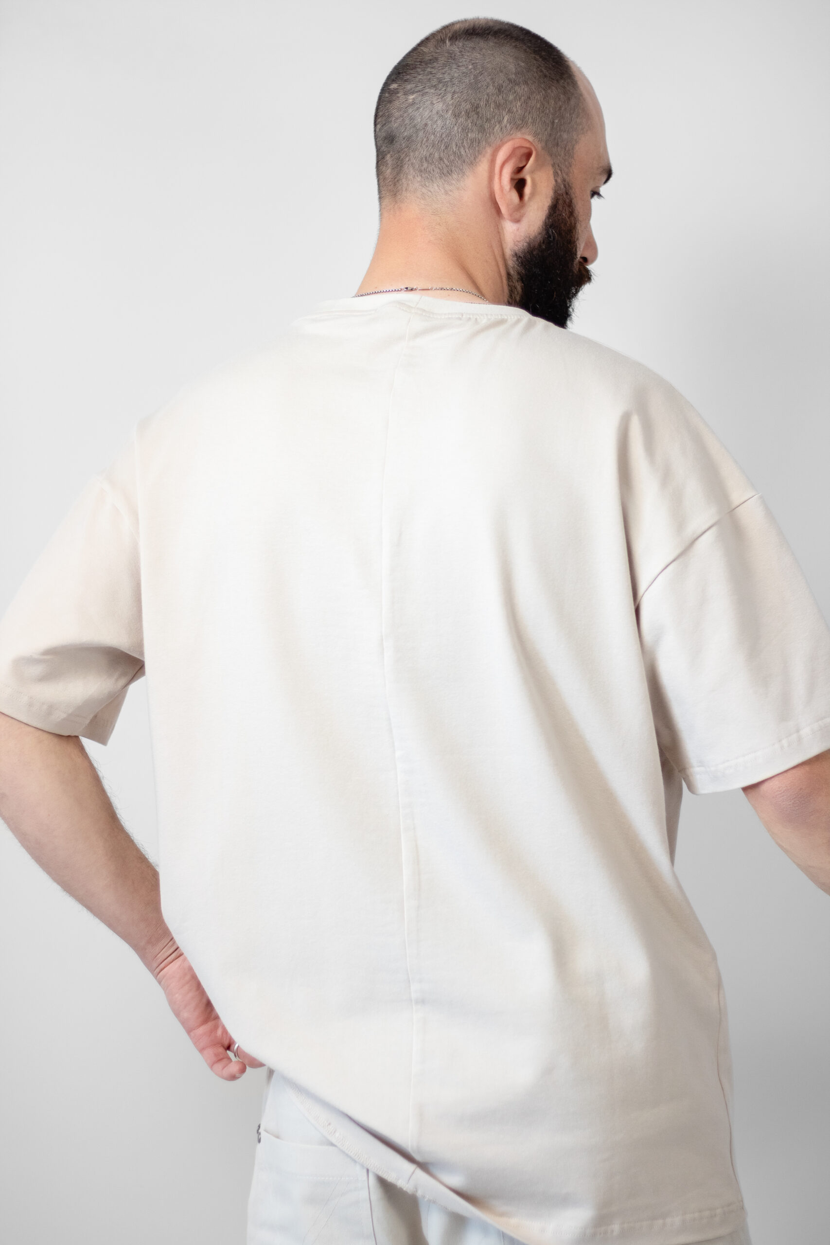 Чоловіча футболка оверсайз з рельєфним швом по спинці. Круглий виріз горловини оброблено щільною еластичною резинкою рібана та бейкою у колір. Всі шви відстрочені. Фасон вільний, напівприталений.