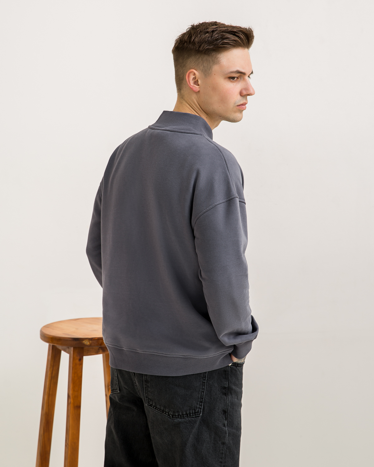 Світшот із щільного футера з ефектом браш з короткою молнією. Довгі рукави, дві бічні приховані кишені “у шві”. Крій напівприталений класичний. Комір, манжети та низ виробу виконані з трикотажної резинки кашкорсе високої щільності. Металева фурнітура УКК (Японія)