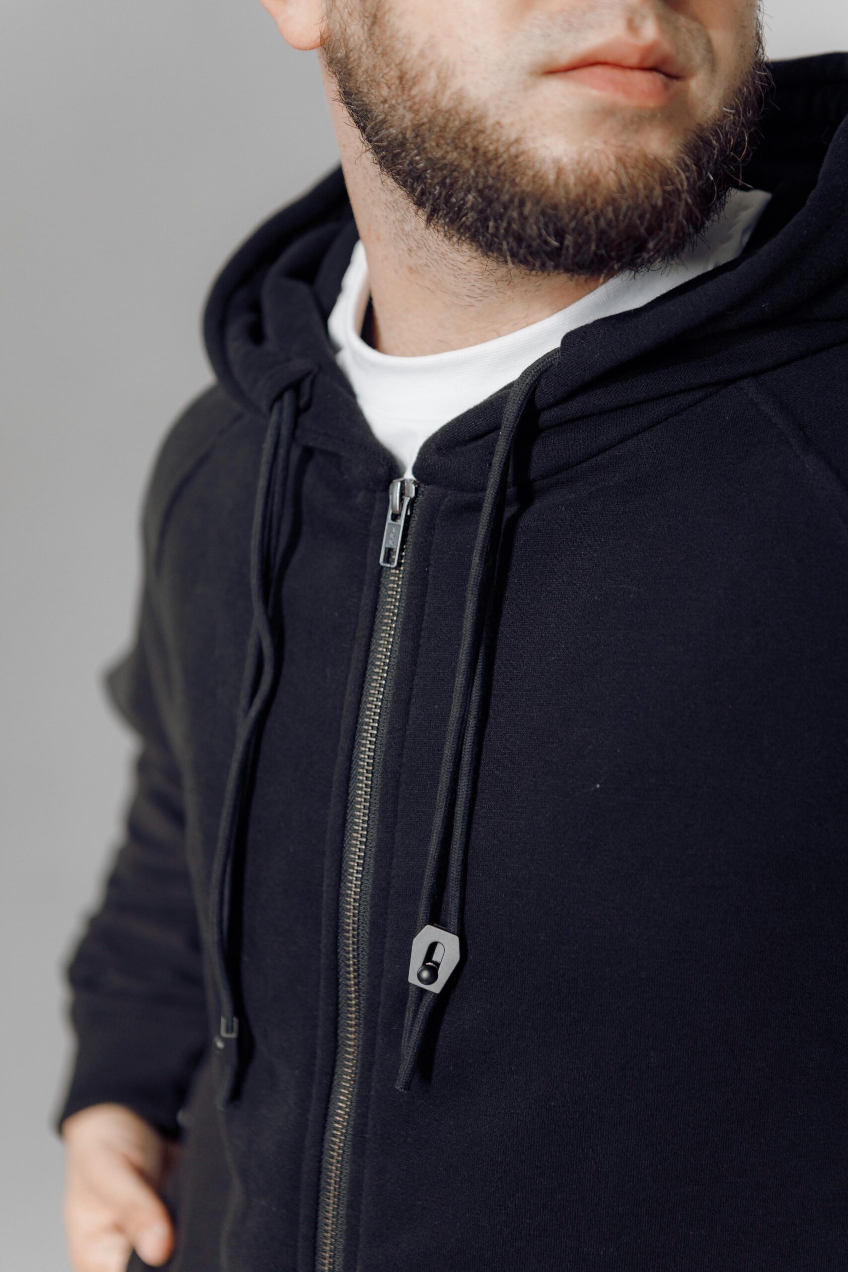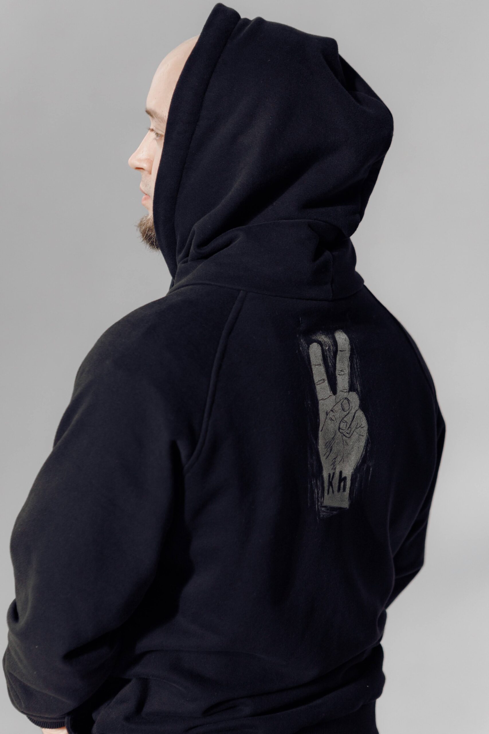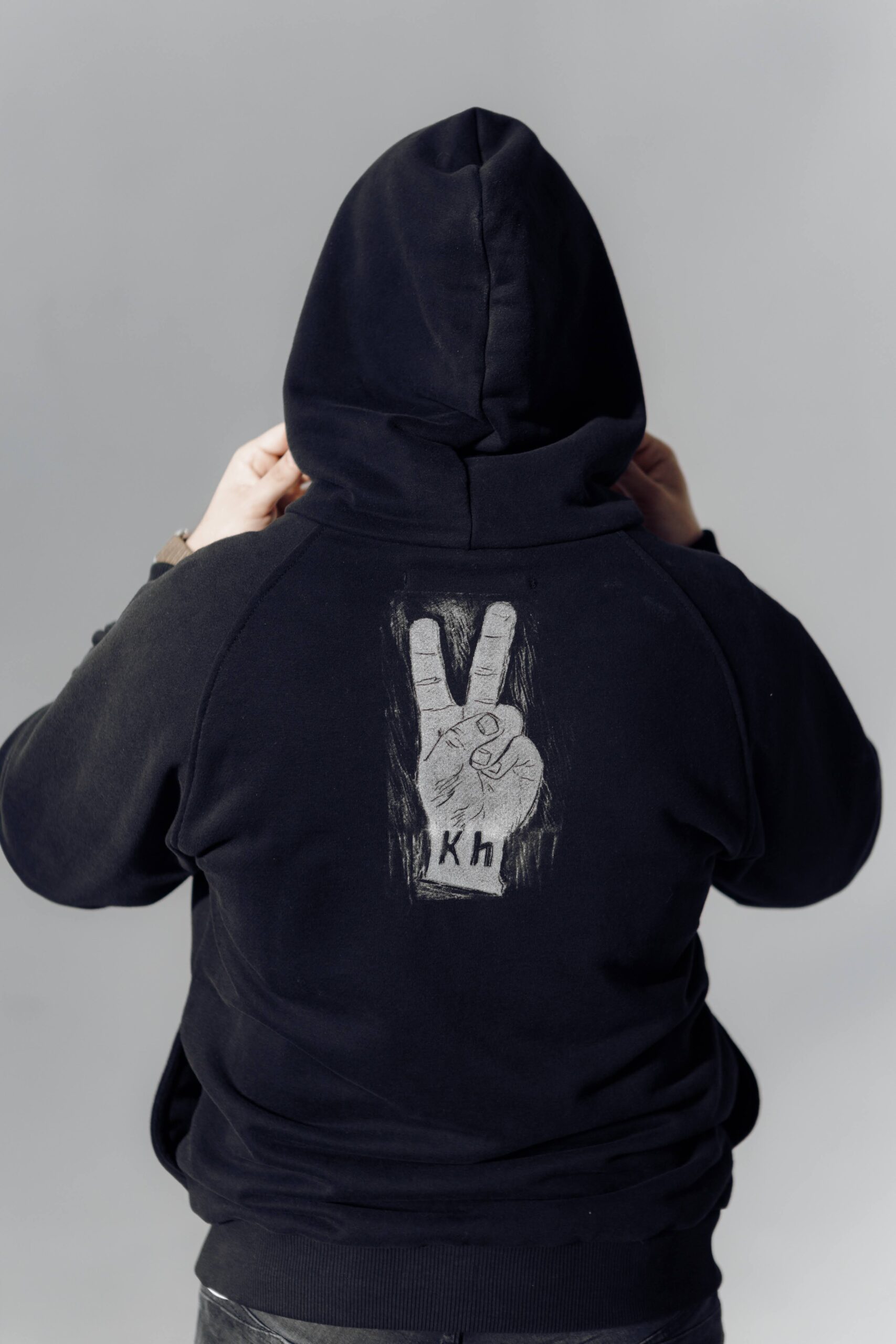 Бавовняне худі з ефектом браш. Довгі рукави реглан. Крій вільний, напівприталений. Дві бічні кишені у шві. Подвійний капюшон з внутрішньою куліскою для регулювання, подвійні бавовняні шнури з металевими фіксаторами. Манжети та низ виробу виконано з еластичного та щільного трикотажу в рубчик. Застібка на блискавку, металева фурнітура УКК. Крафтовий принт Kharkiv (Харків), срібна матова олійна фарба.