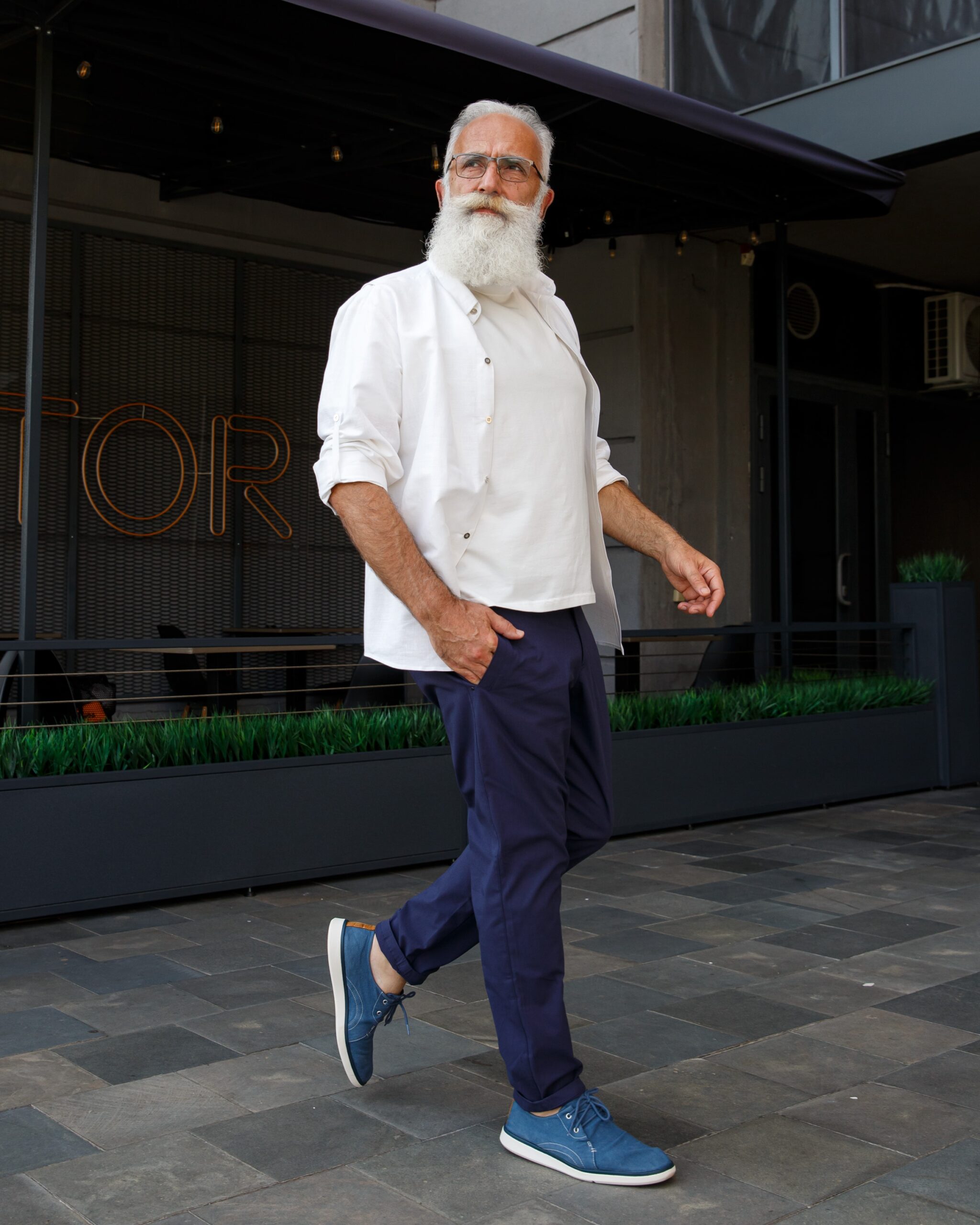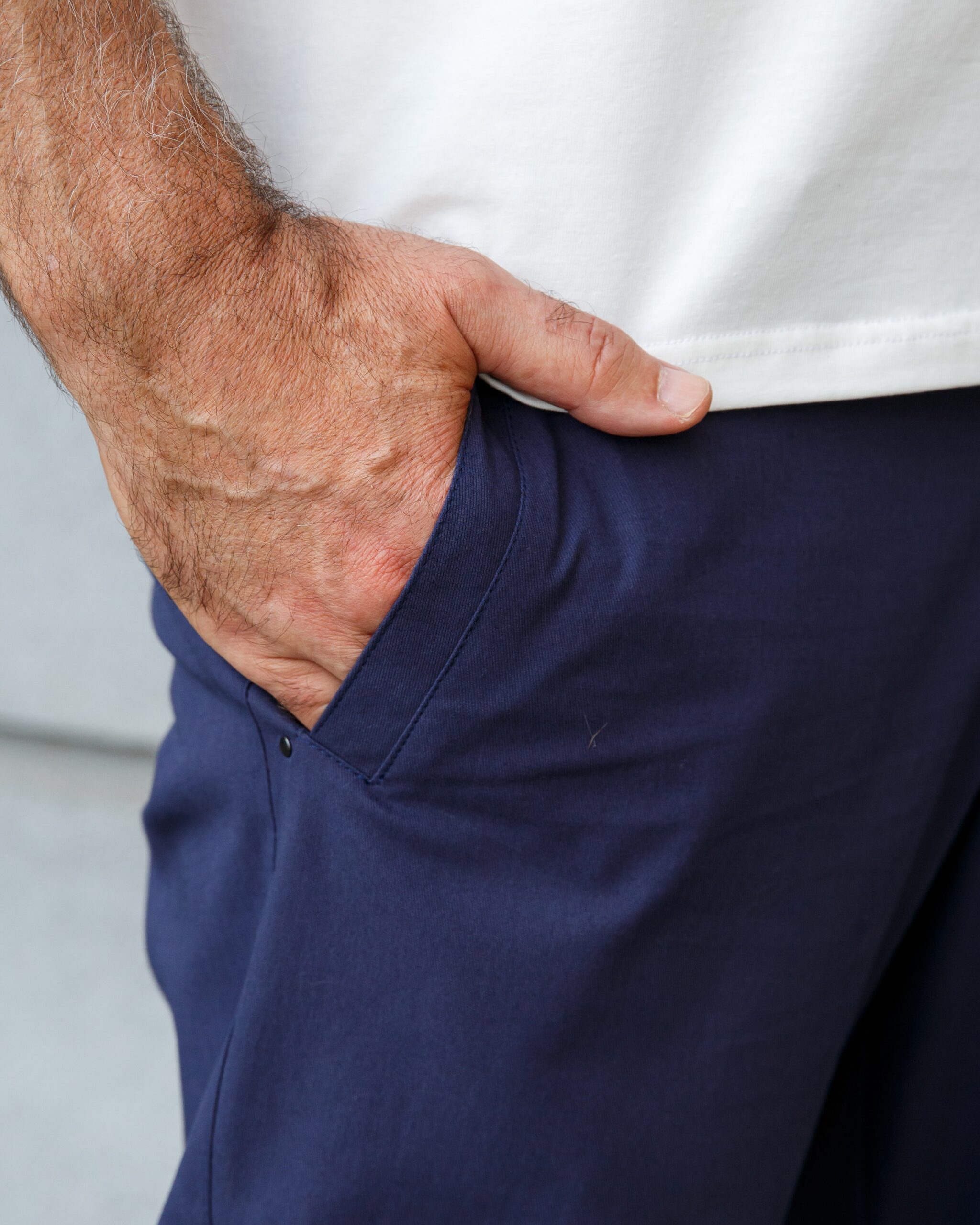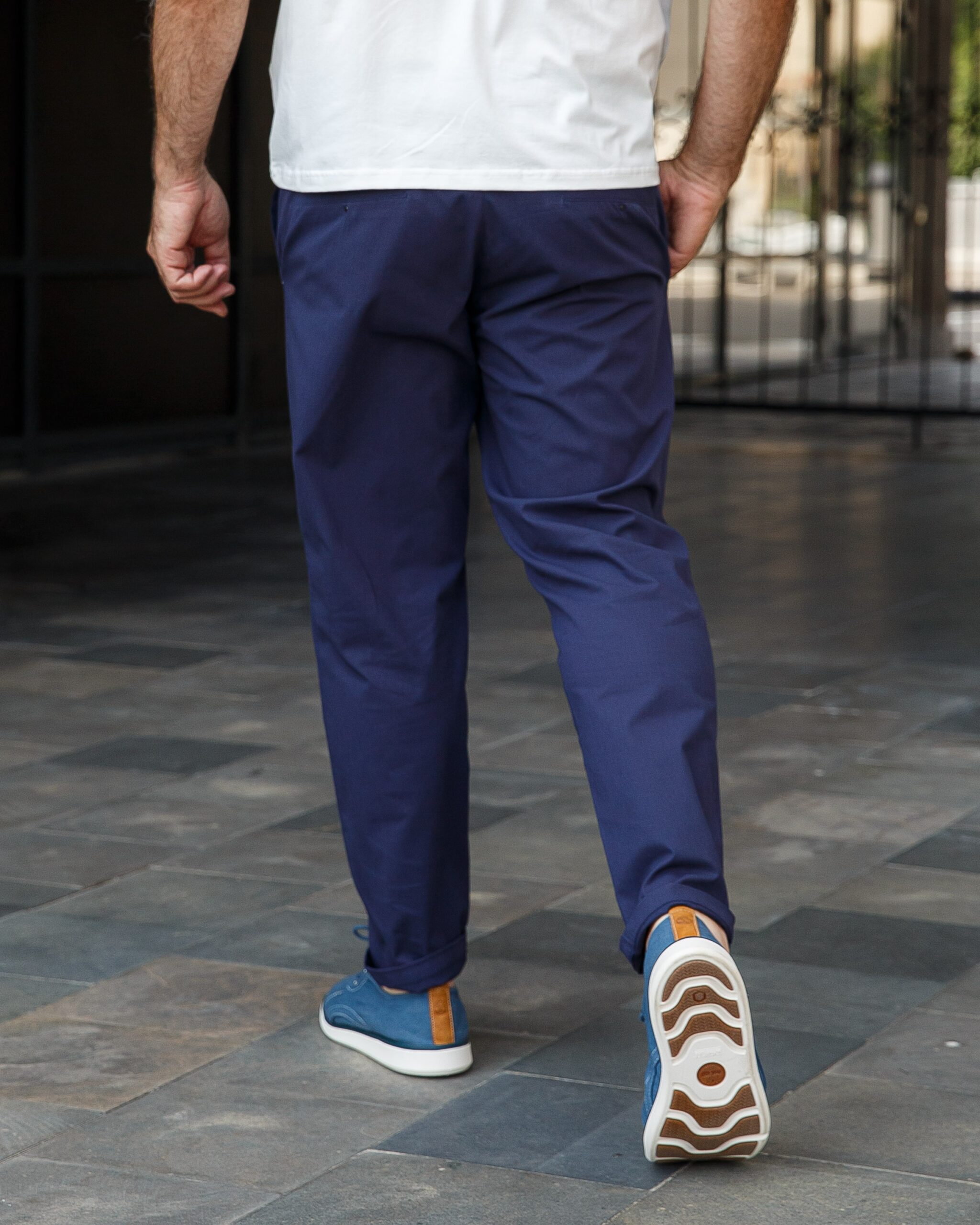 Опис. Чоловічі штани-чіно з еластичної бавовни діагонального плетіння. Крій завужений. Середня довжина (зріст моделі 185см). Застібка на блискавку та гудзик (металева фурнітура УКК). Дві бічні кишені, дві задні кишені-обманки, передня міні-кишеня для дрібниць під поясом. Посадка на талії, шльовки під пояс/ремінь.