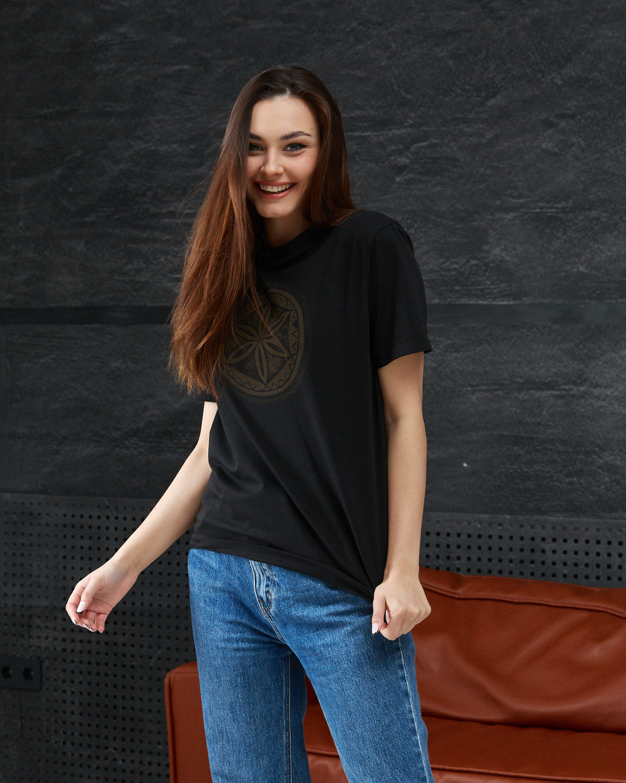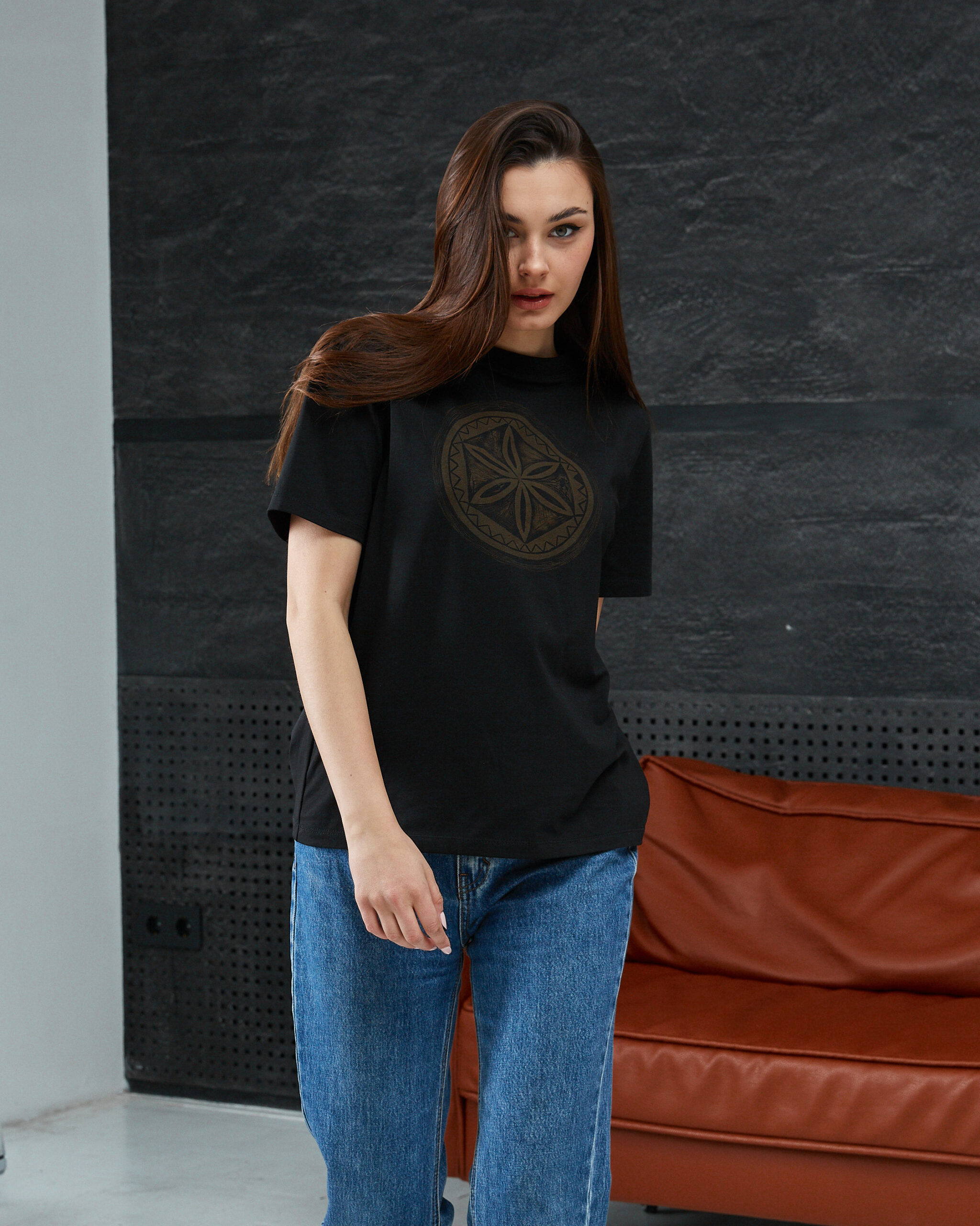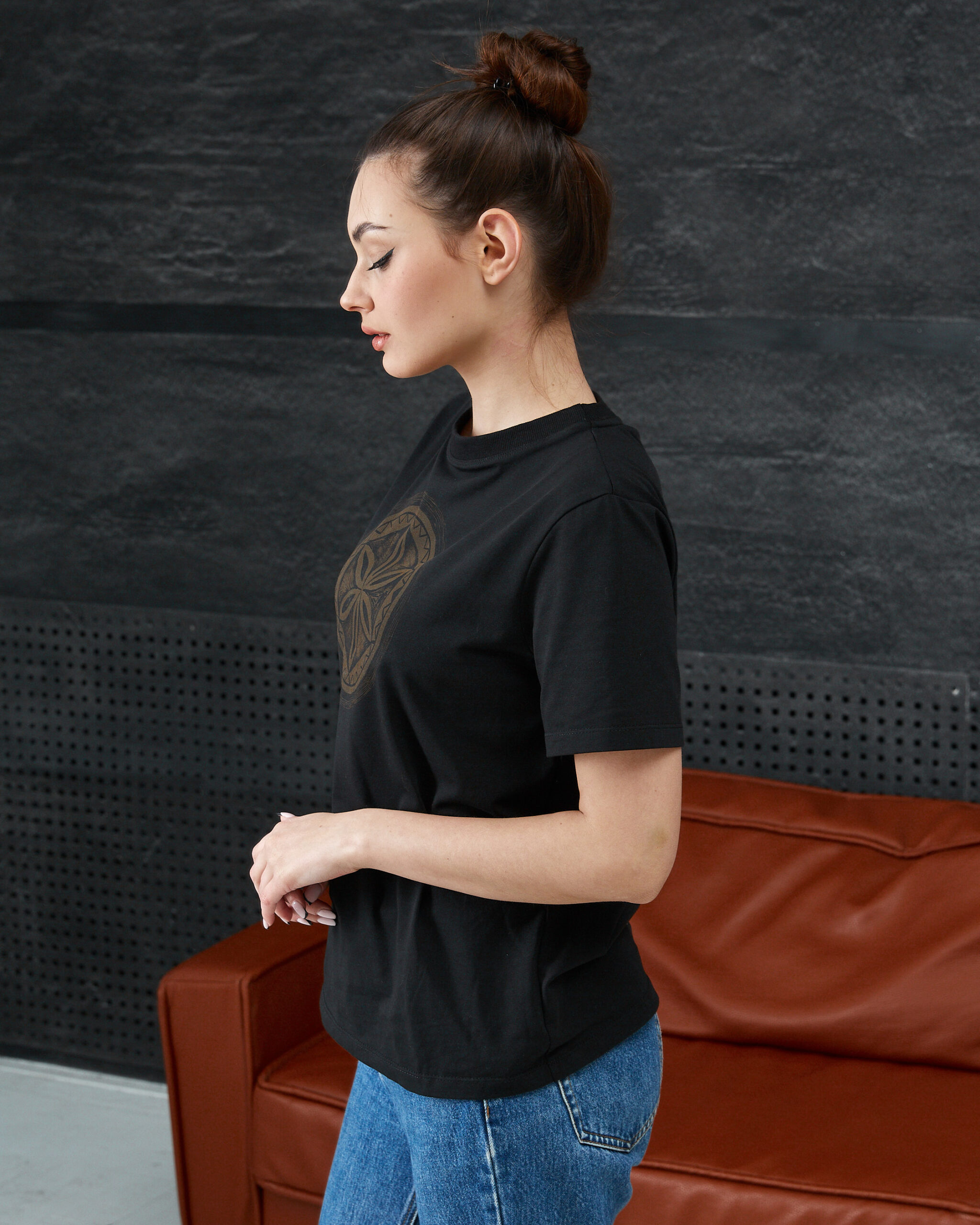 Чорна жіноча футболка з принтом у вигляді Зірки Перуна. Фасон напівприталений. Короткі рукави. Круглий виріз горловини, оброблений трикотажною резинкою рібана в колір.
