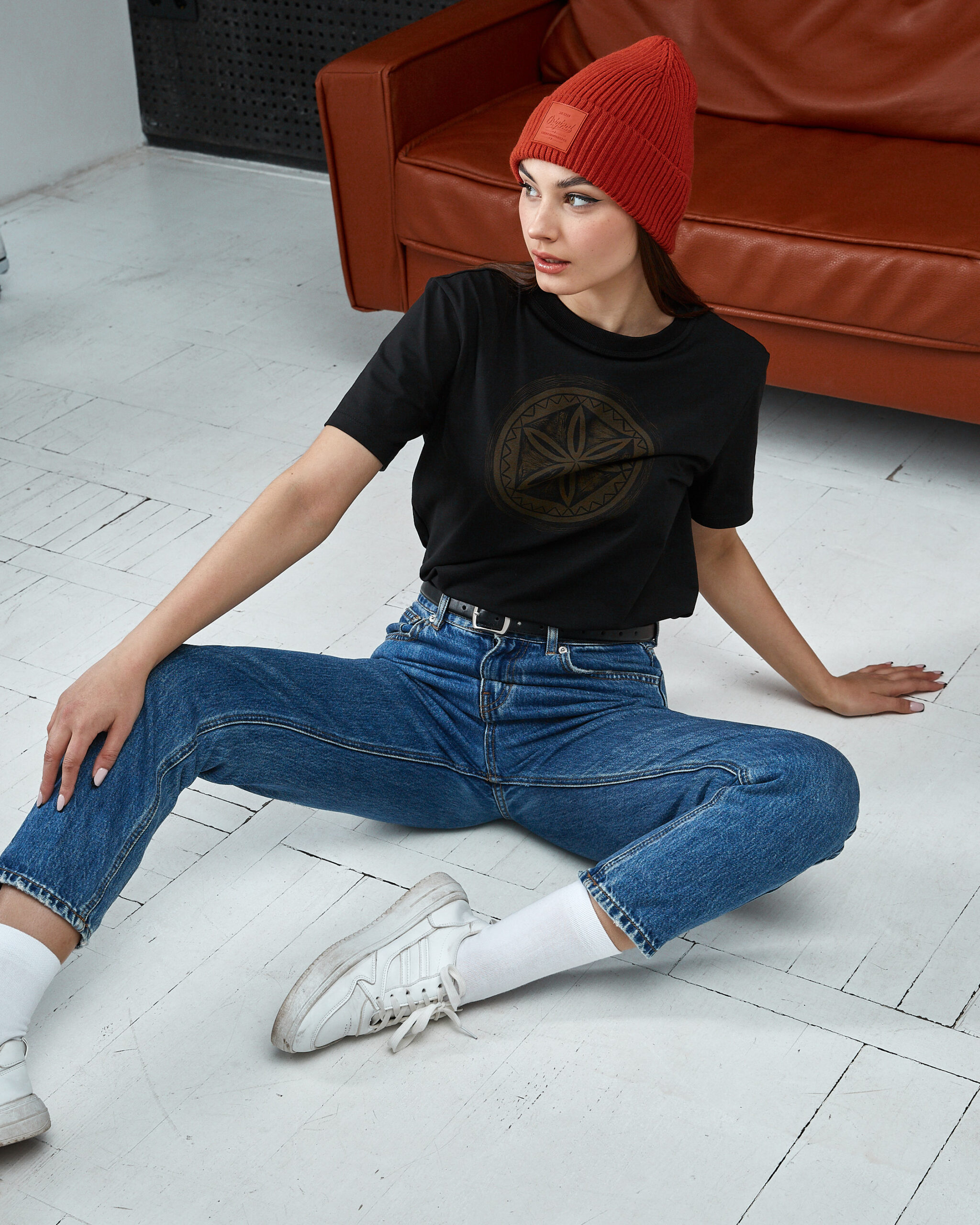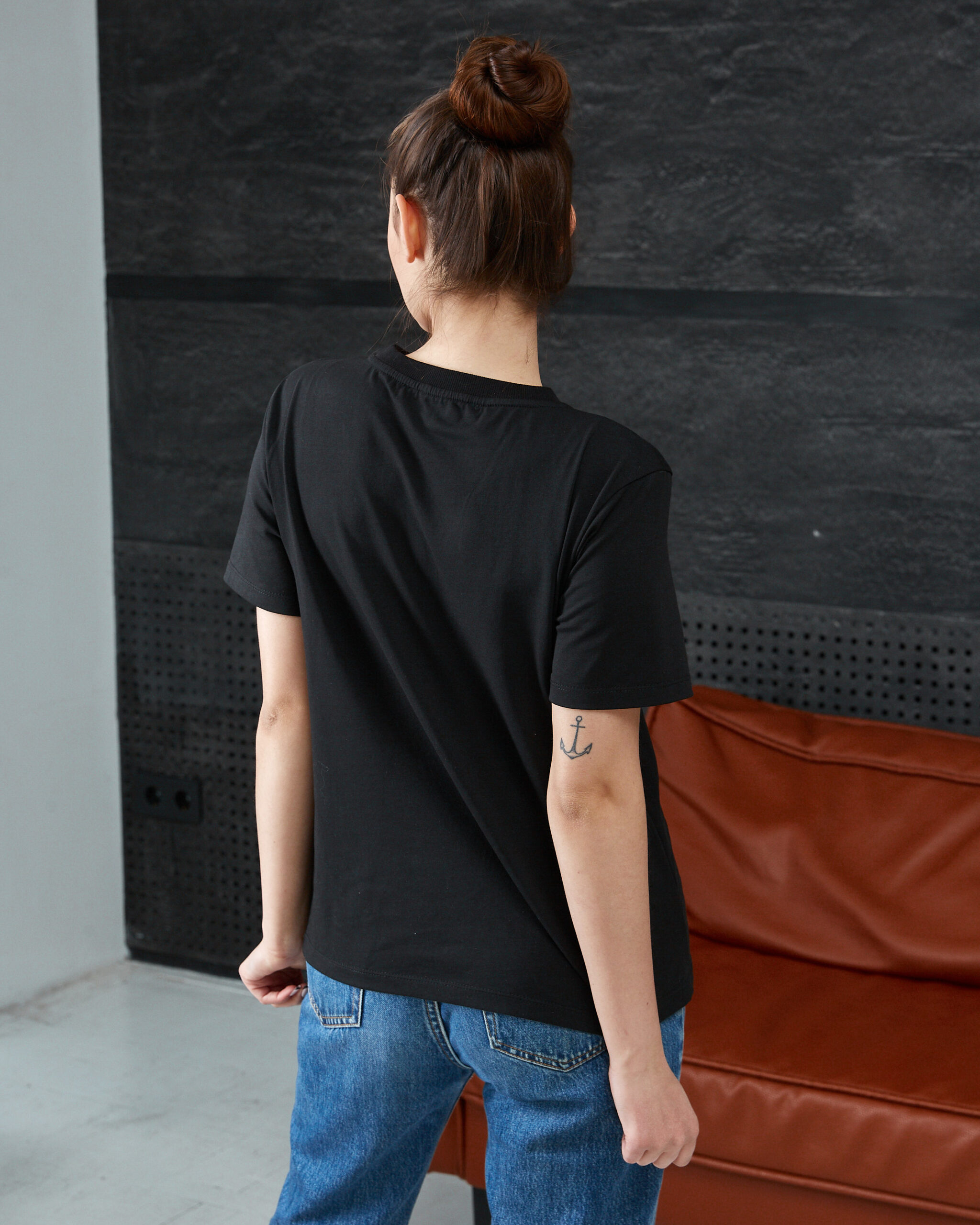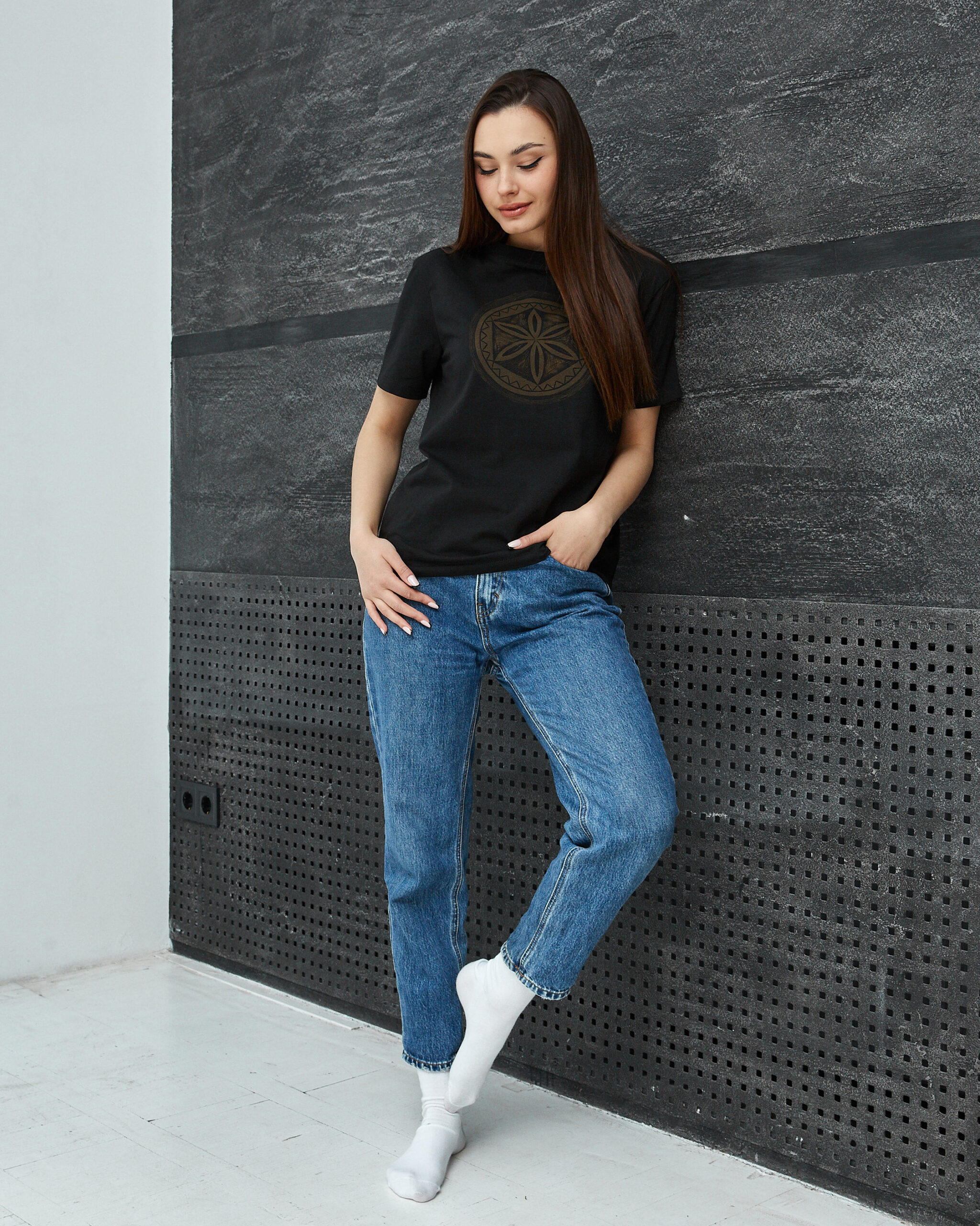 Чорна жіноча футболка з принтом у вигляді Зірки Перуна. Фасон напівприталений. Короткі рукави. Круглий виріз горловини, оброблений трикотажною резинкою рібана в колір.