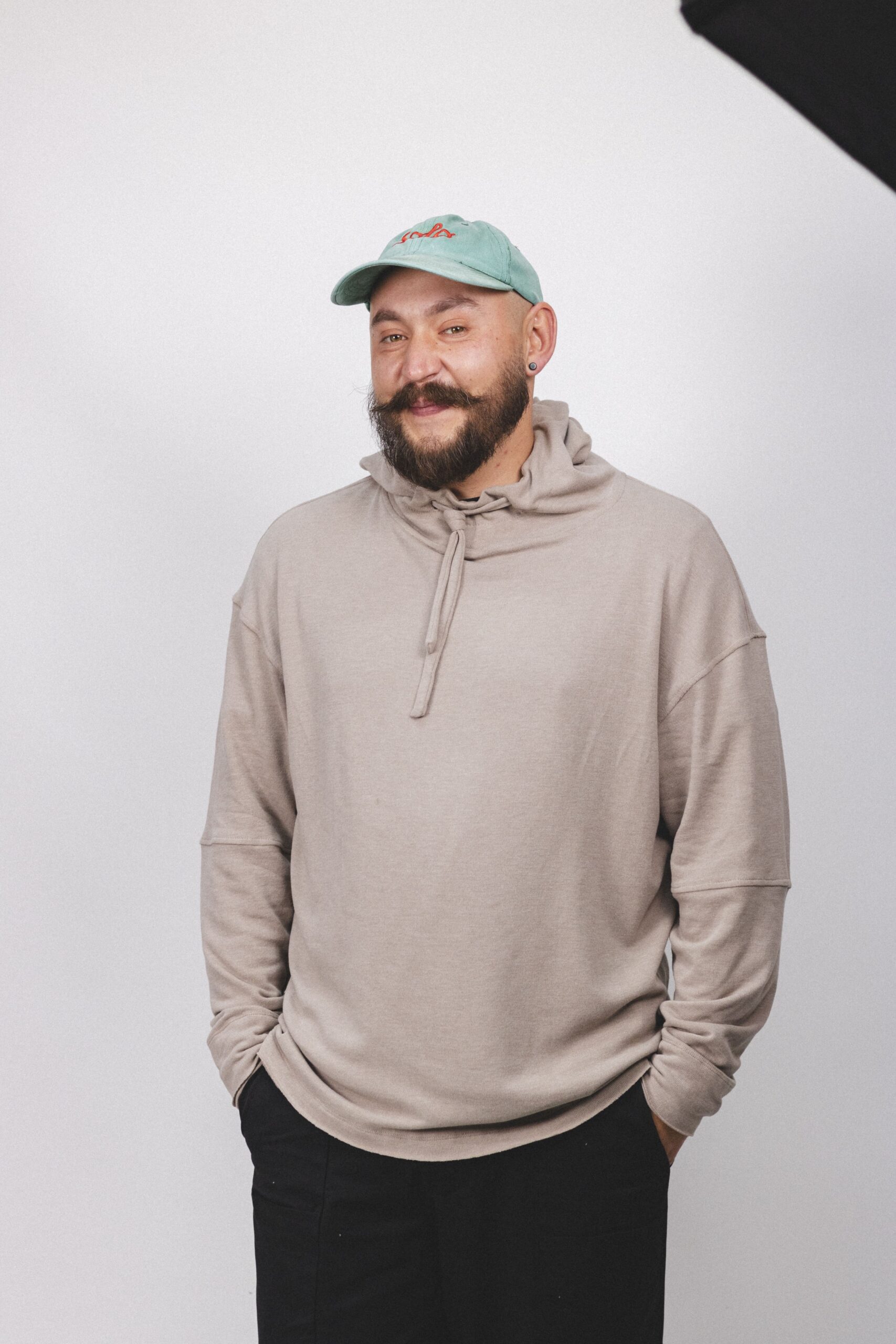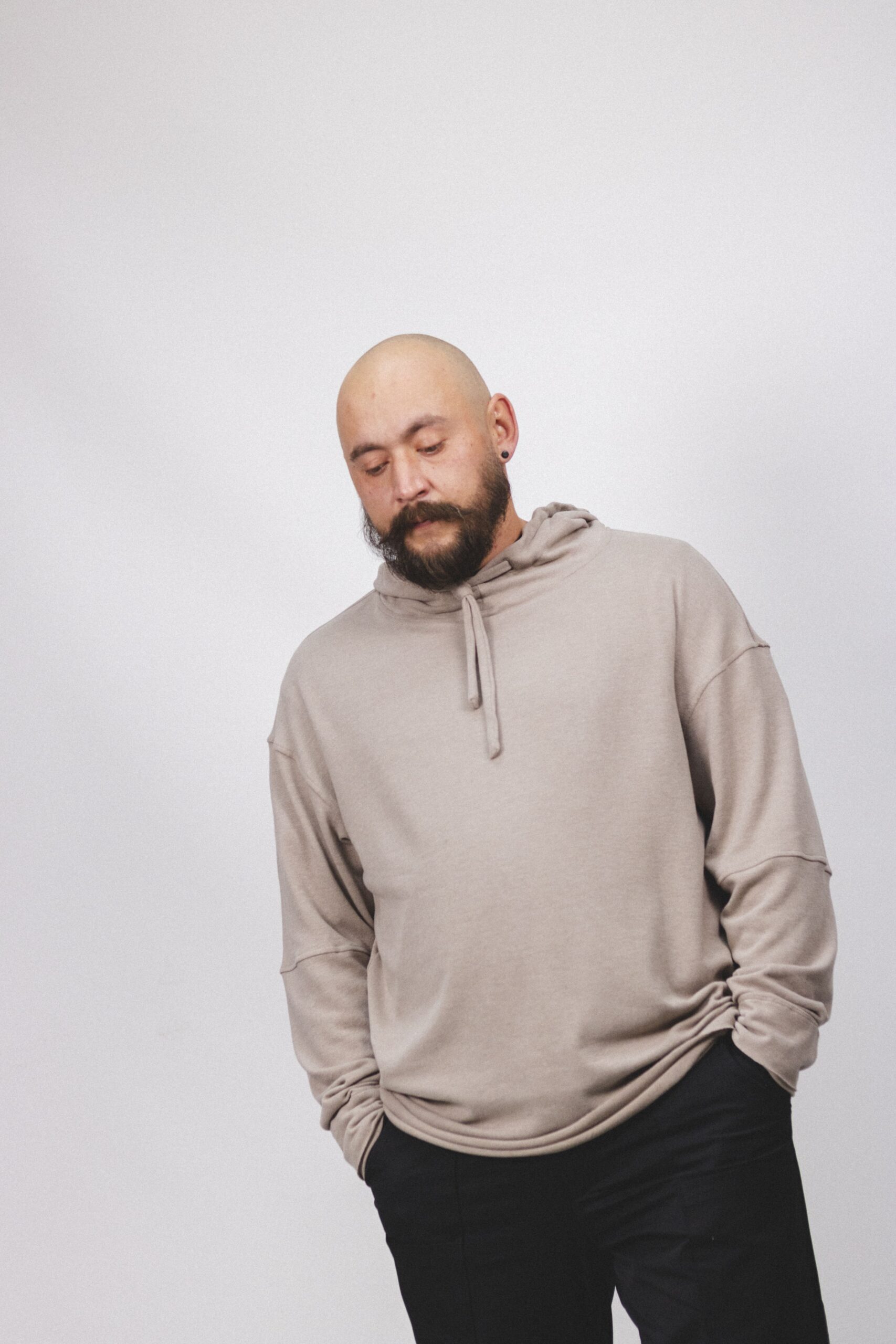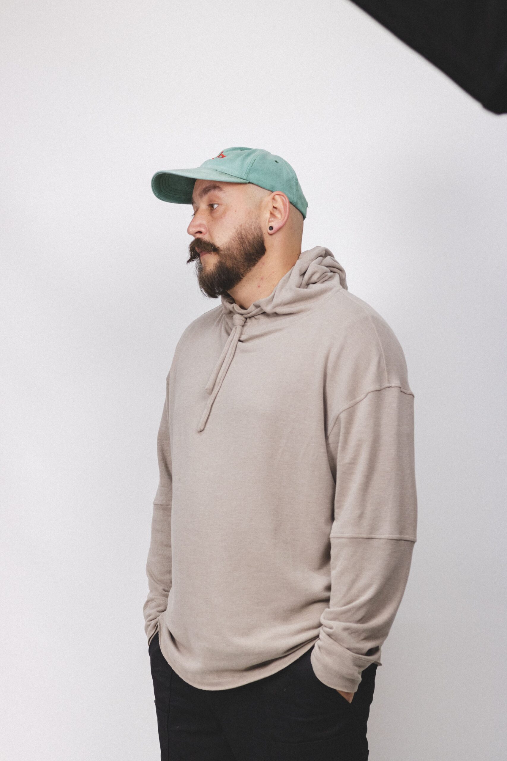 Худі з пом’якшеного італійського трикотажу. Має подвійний капюшон, що регулюється шнуром з такої ж тканини. Подвійні манжети з отвором для великого пальця. Рельєфні шви по спинці та рукавах.