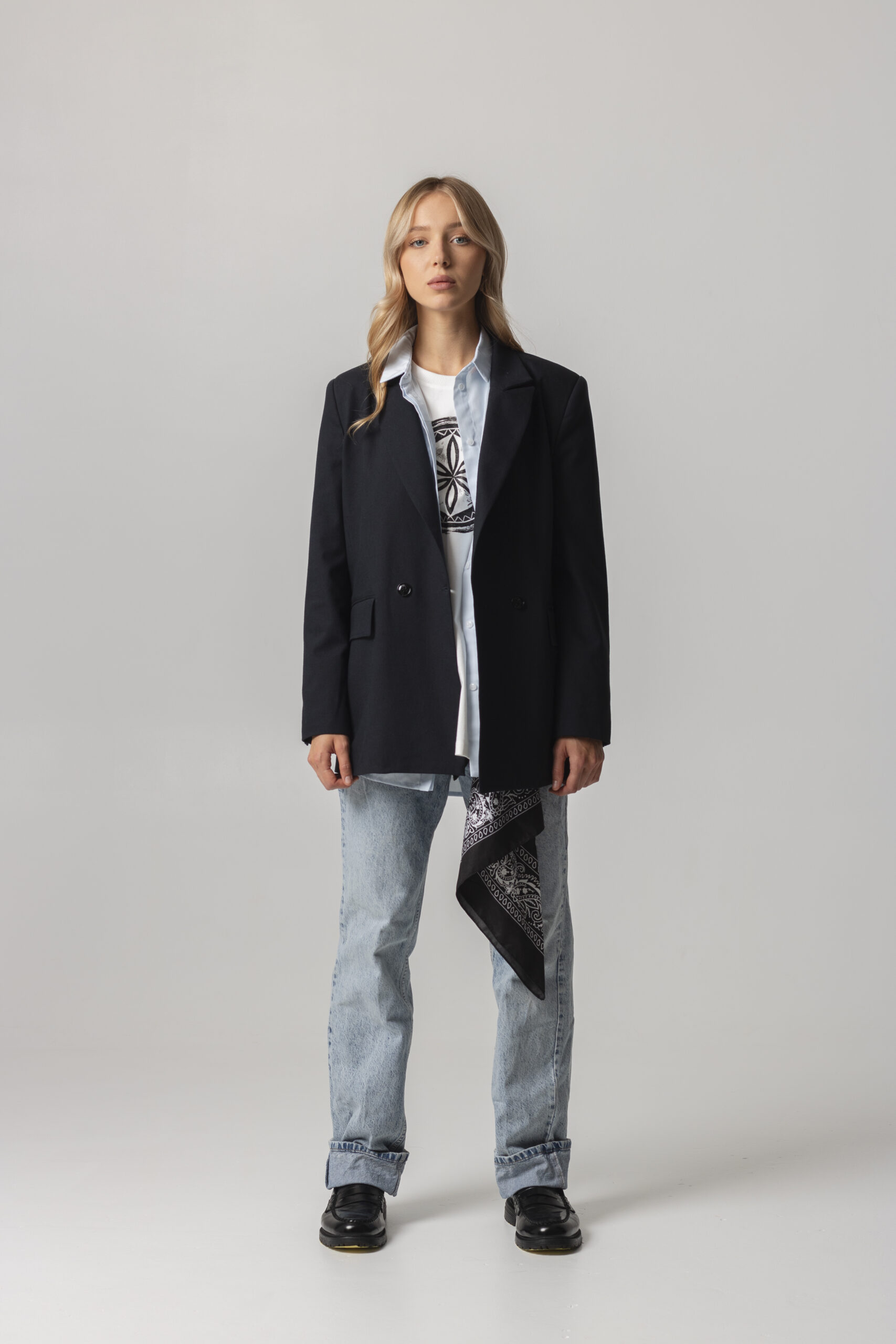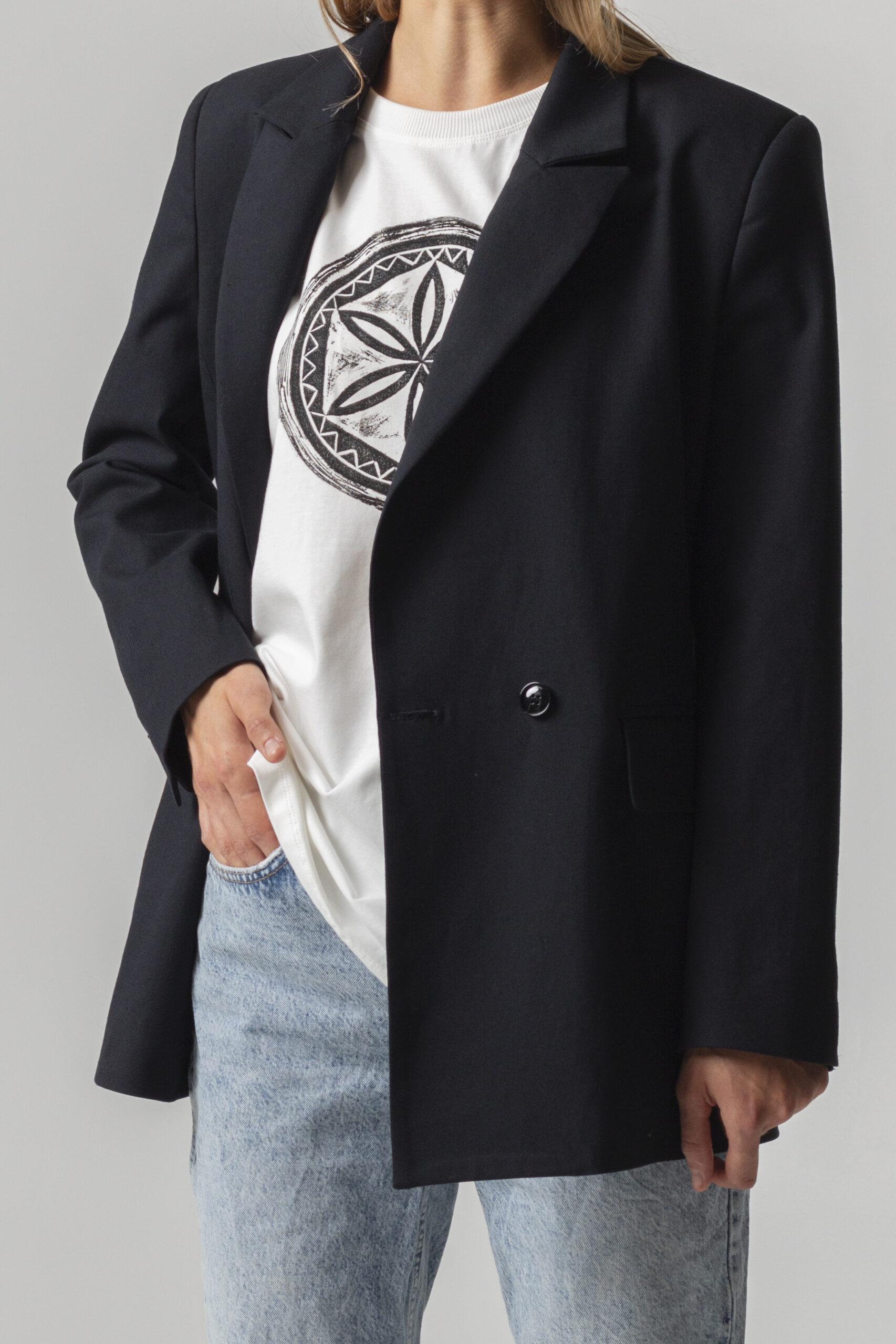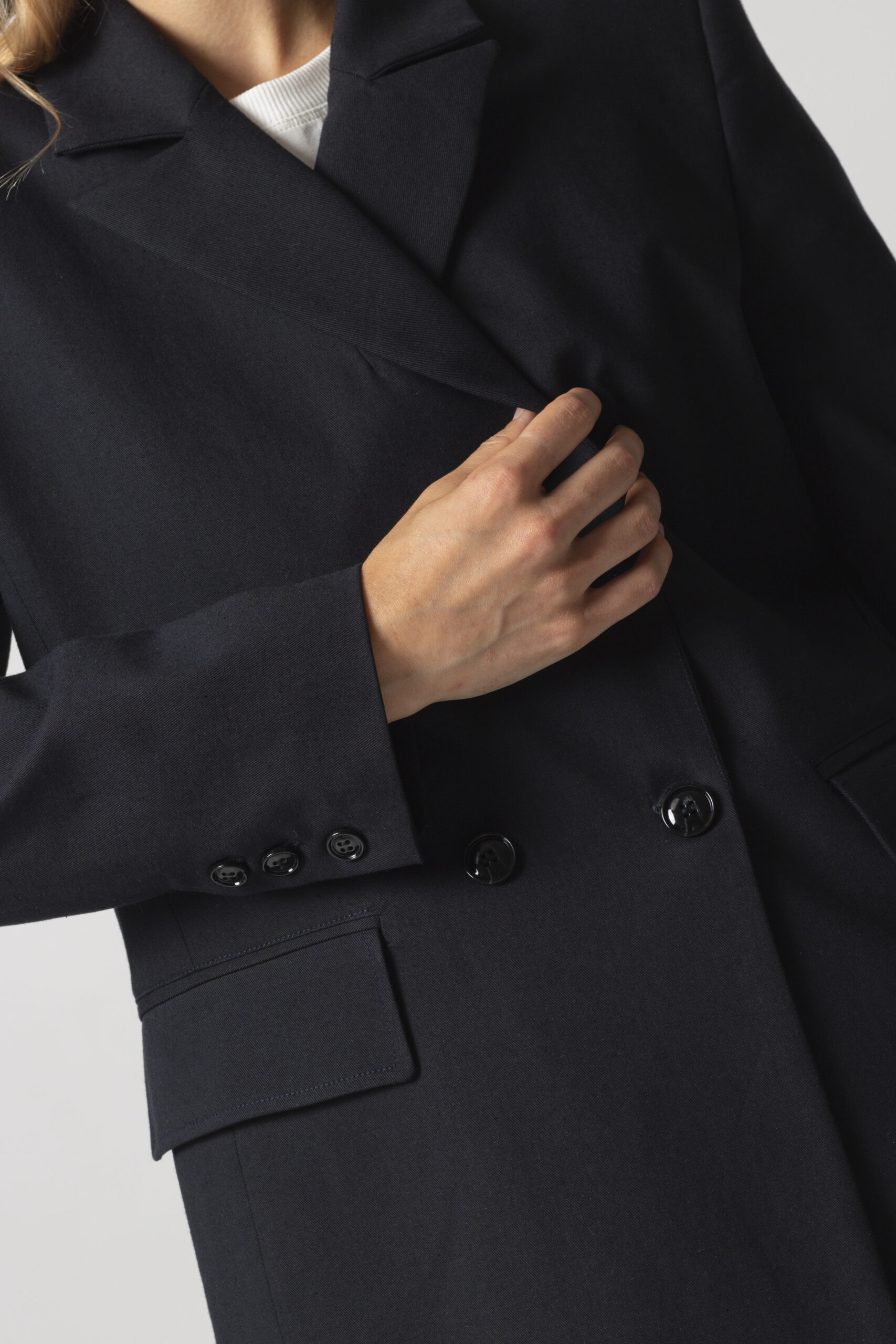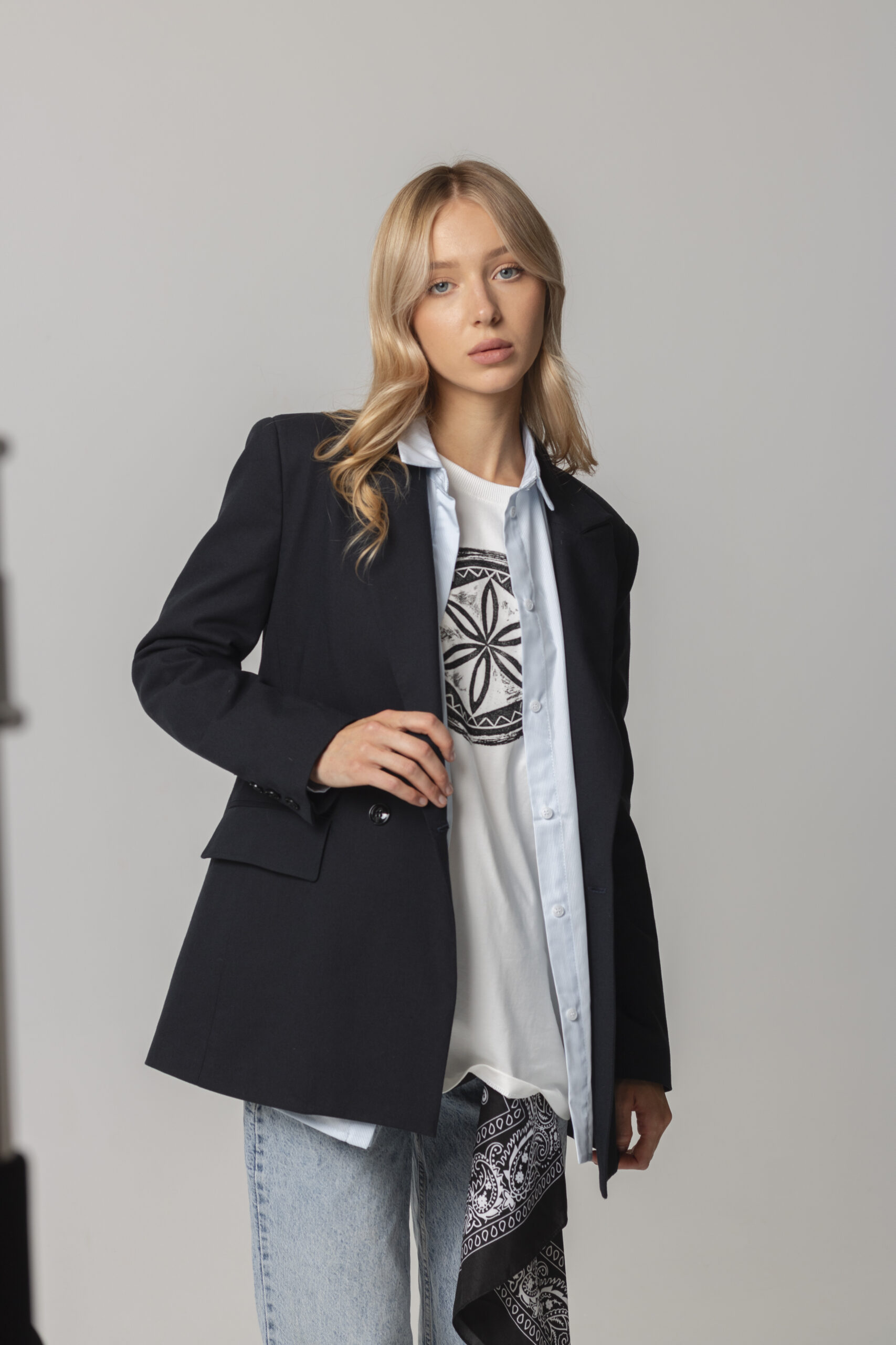 Двобортний жакет з щільного італійського котону вищої якості. Застібається на два гудзики. Довгі прямі рукава з трьома гудзиками. Має класичний комір V-подібними лацканами. Дві передні кишені з клапанами. З виворітного боку оздоблений білим кантом. “Вушко” для вішалки.