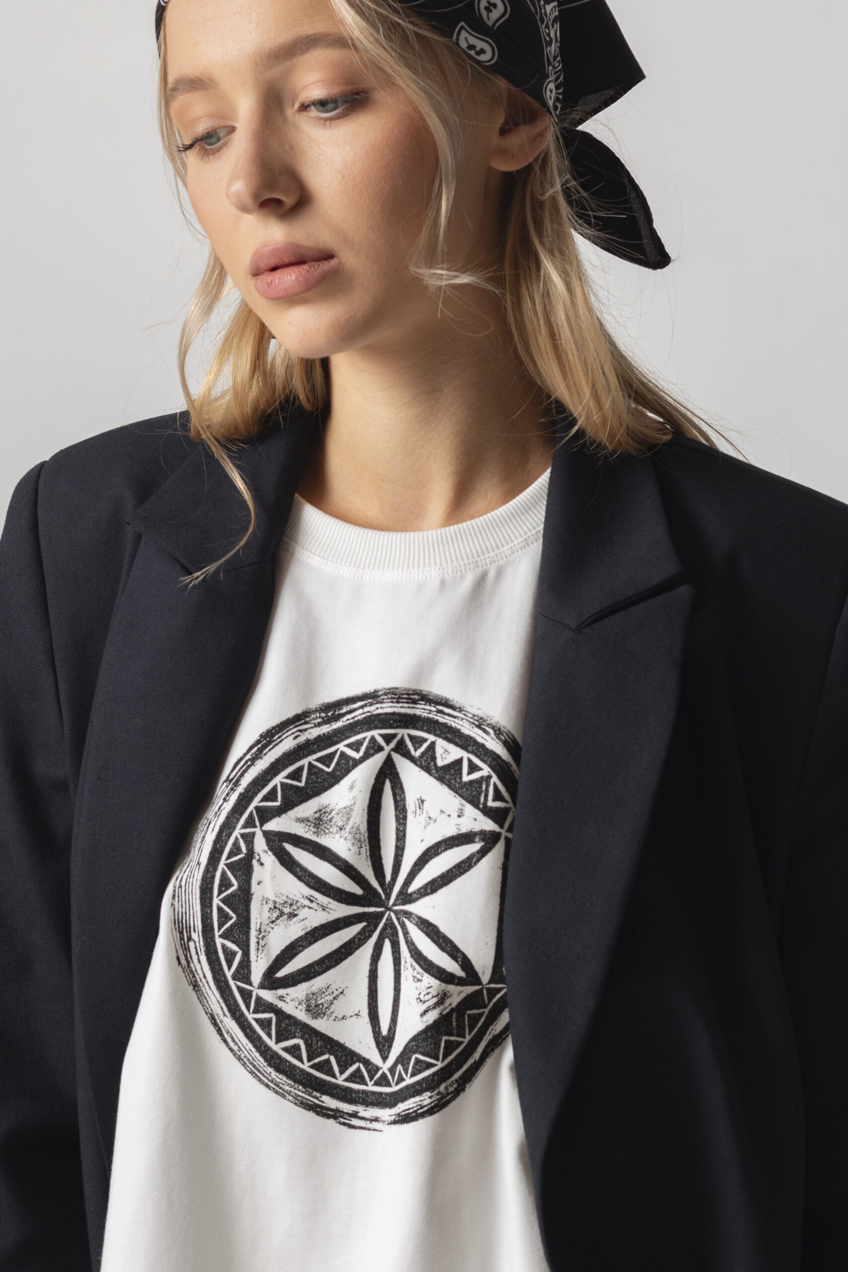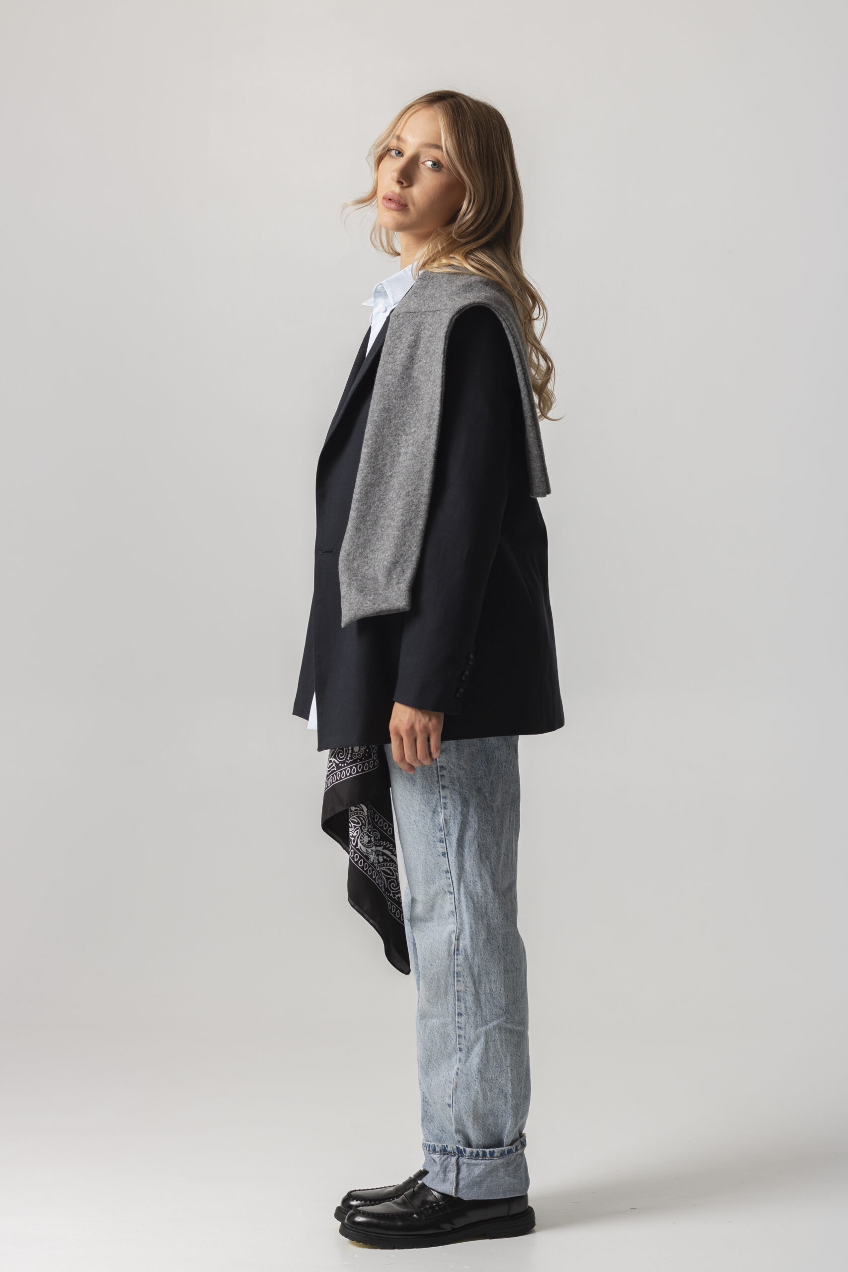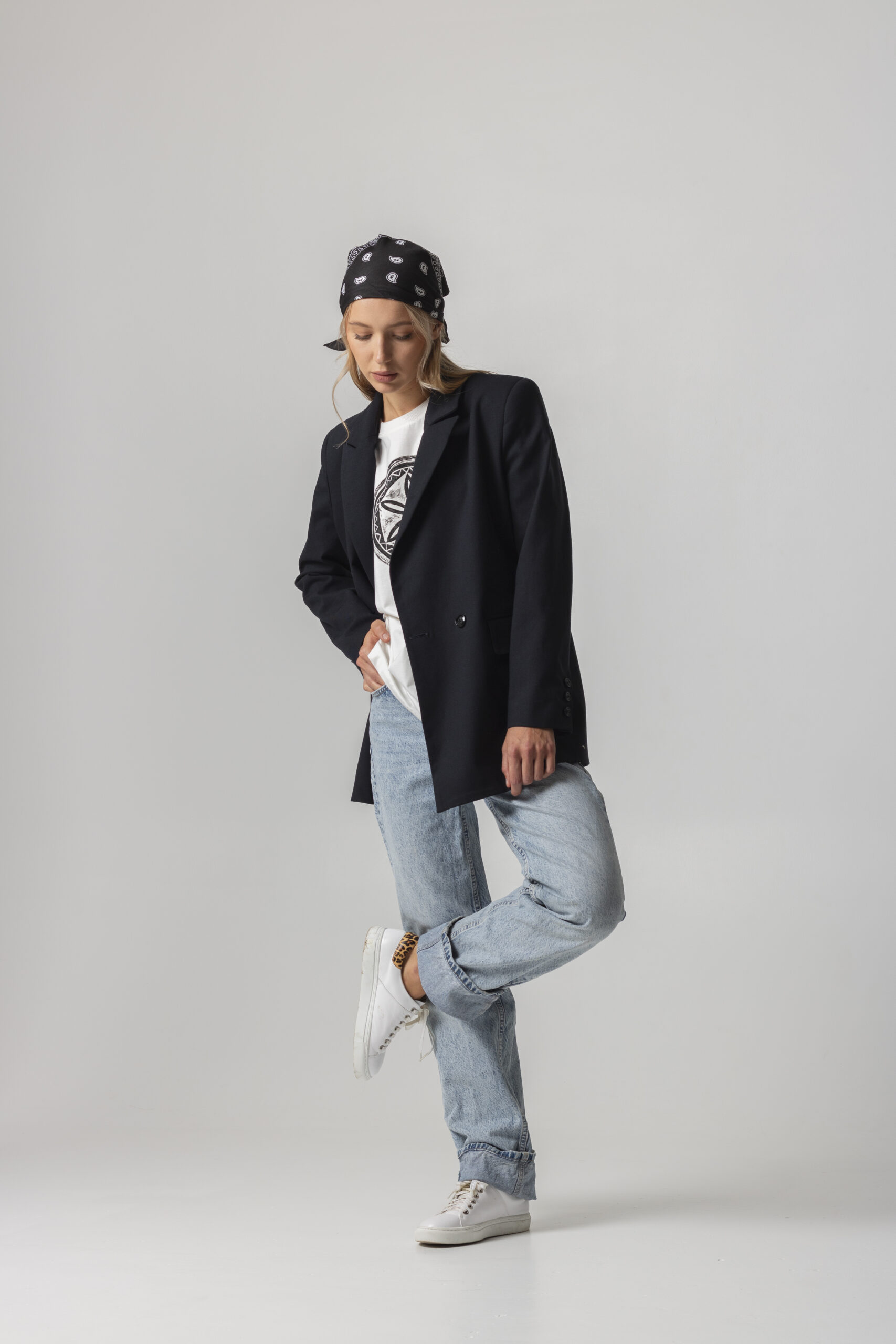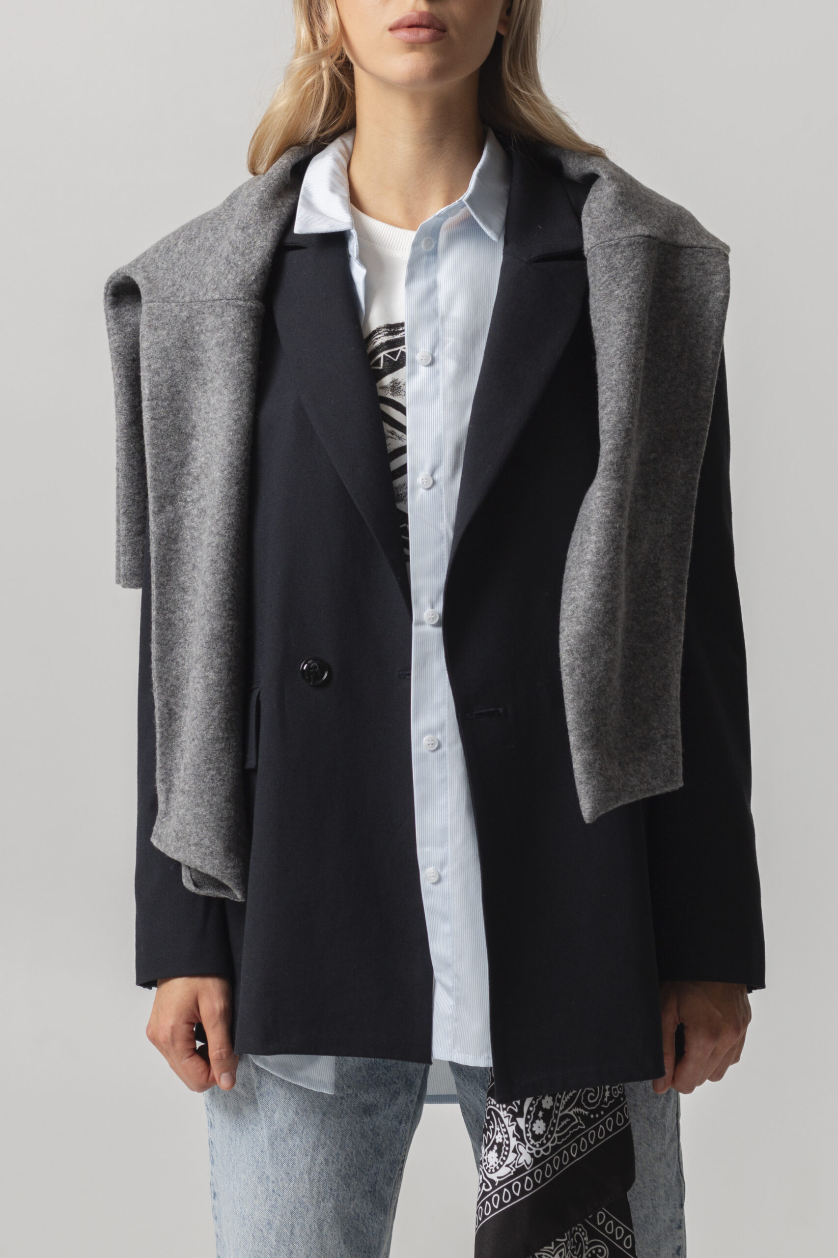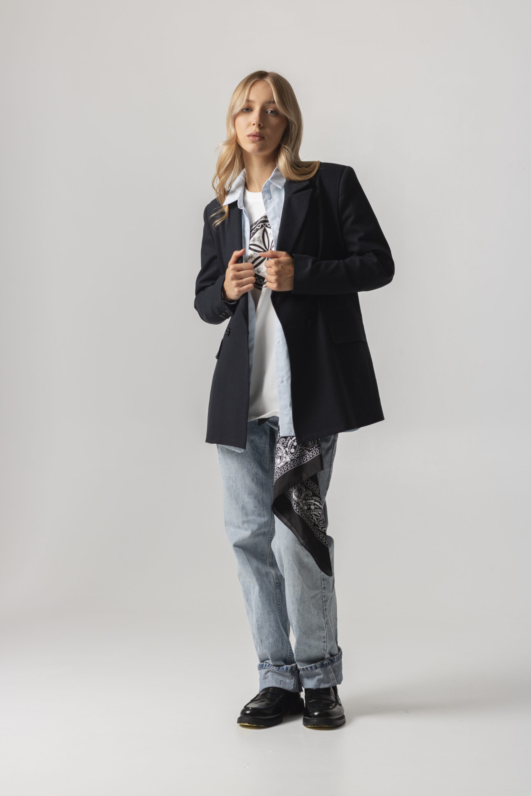 Двобортний жакет з щільного італійського котону вищої якості. Застібається на два гудзики. Довгі прямі рукава з трьома гудзиками. Має класичний комір V-подібними лацканами. Дві передні кишені з клапанами. З виворітного боку оздоблений білим кантом. “Вушко” для вішалки.